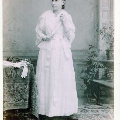 H&I = Photo of teen girl. Sepia. Full length. She is wearing long white dress with flounce at base of bodice, ¾ length sleeves with large lace cuffs. She is holding a fan and wearing a pendant necklace and has a bracelet on her right arm. A pair of long white gloves are draped over a table on her left. Her light hair is pulled back and tied with ribbon. 2 copies. Uhlman, Photographers. 4¼" x 6½" Handwritten on back: "Agnes Conrad, Graduation, Age 18, 1891"Collection
