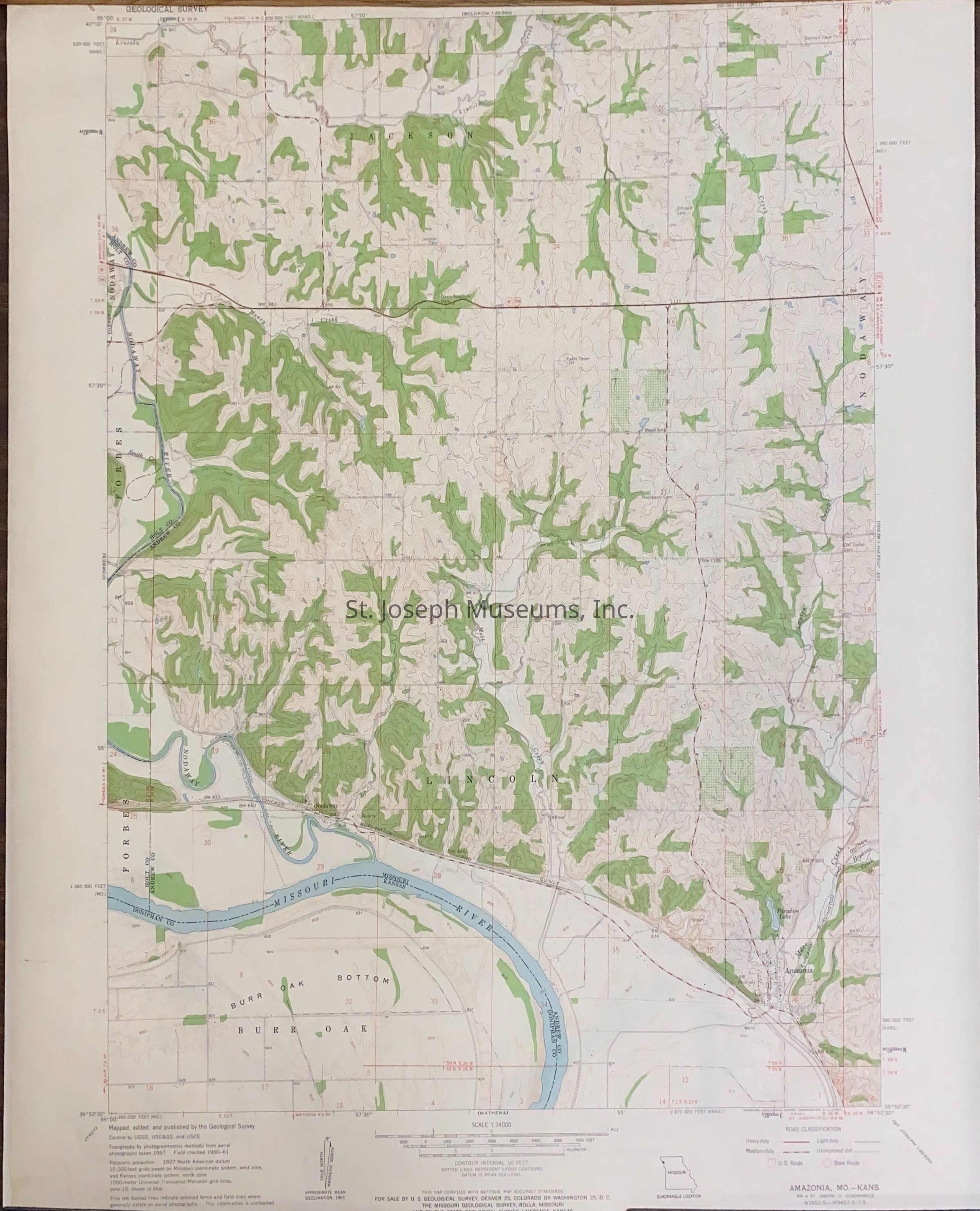 Amazonia Quadrangle, Missouri-Kansas, Map, 1961. Topographical map of portion of Andrew County, Missouri along Nodaway River and section of Burr Oak in Doniphan County, KS along Missouri River. 7.5 minute series.Lexicon