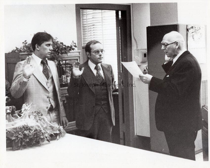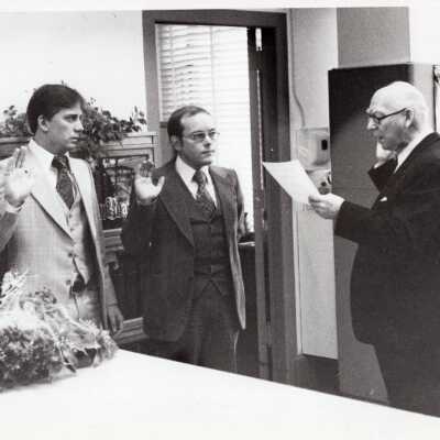 City Council Member, Jim Connors Taking Oath of Office, 1980. b/w. Walter Welsh, right, administering oath of office to Jim Connors, center, and unidentified man. dated on back: "1980". Taken in office, Christmas decoration on counter.Made/Created