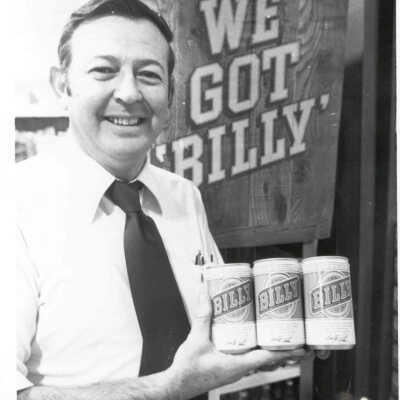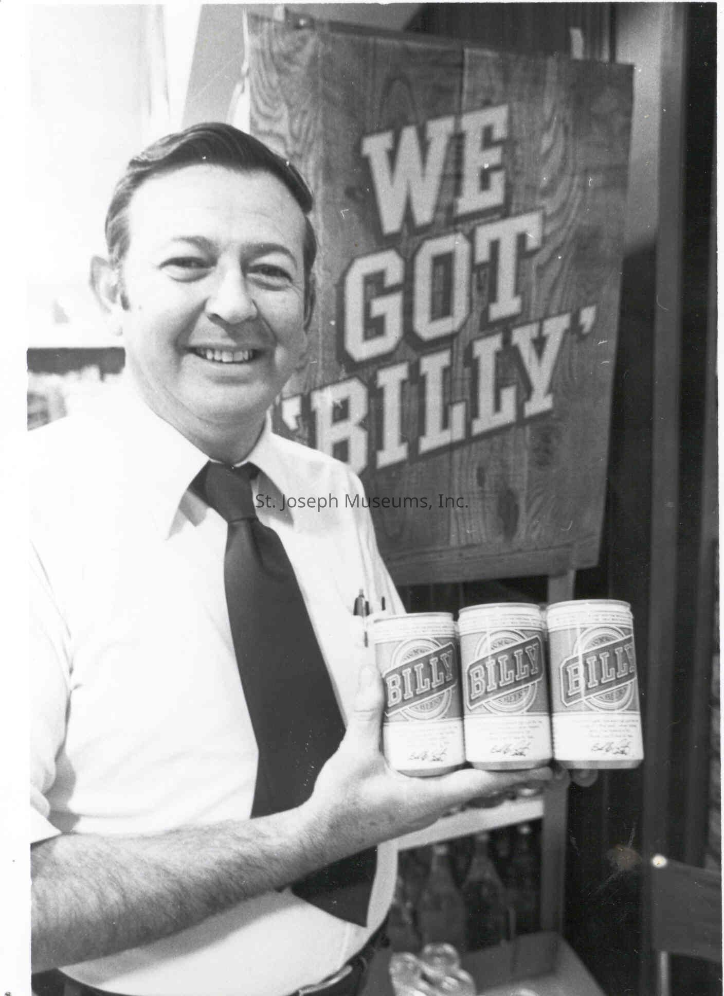01.11.50 = Unidentified man holding six pack of Billy Beer, popular during President Carter's administration, as it was sold by his brother, Billy Carter. c. 1976.