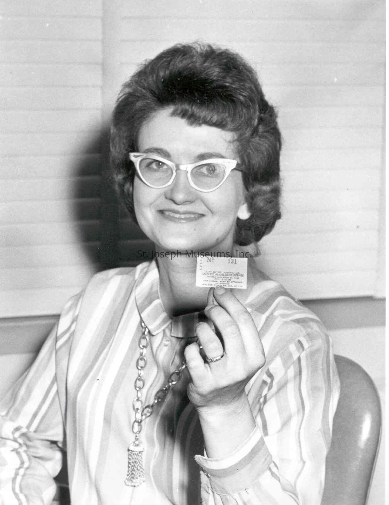 01.11.48 = Woman holding up small card, which is City of St. Joseph Coin Op. Amusement License. L.C. Shady, Photographer, c. 1960s.