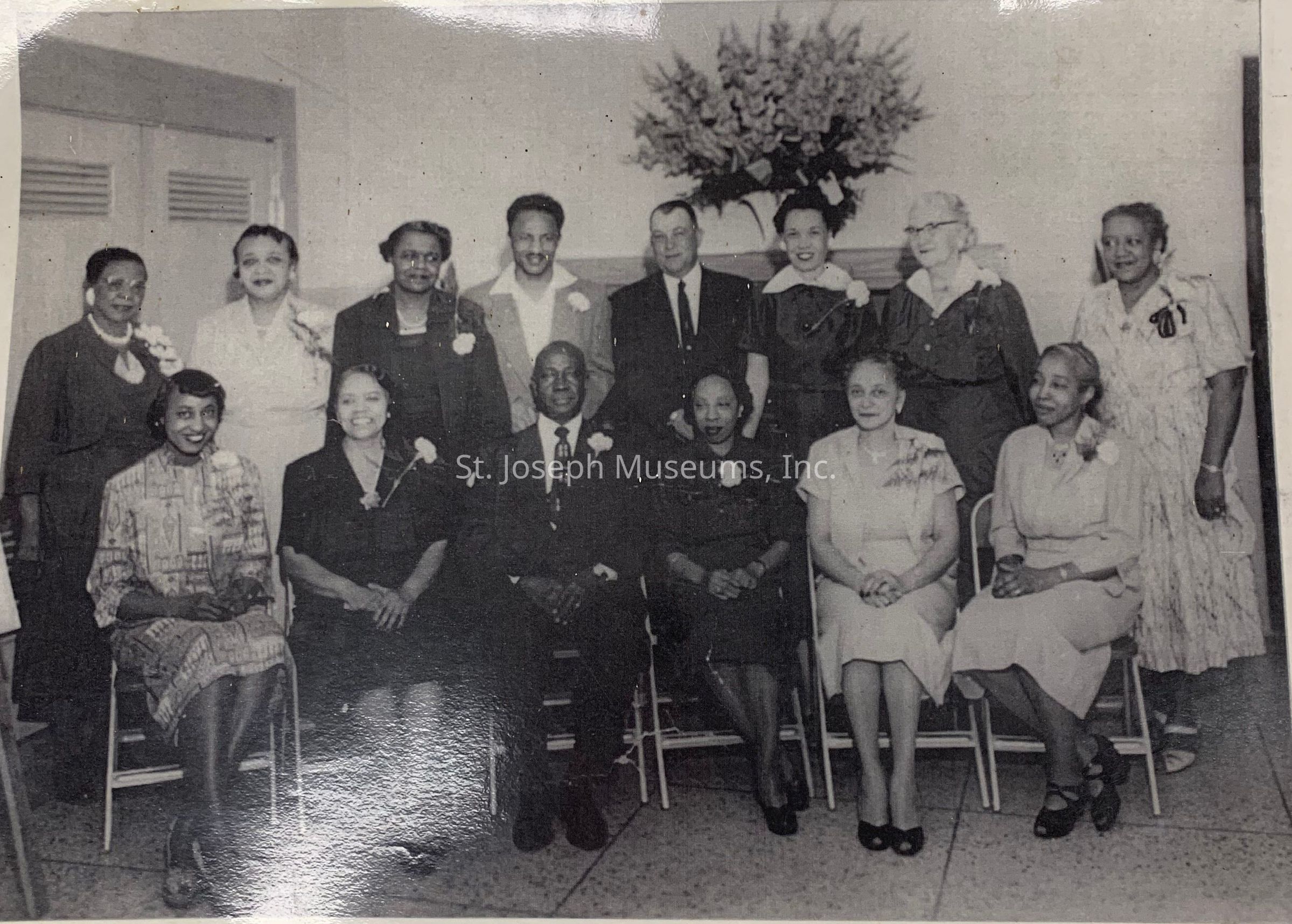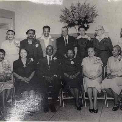 Group photo of 2 African American Men and 11 women at a social occasion of some note. A single white man (standing) in the middle of the group is perhaps a government elected official. Except for this "official" all are wearing a carnation. Undated.