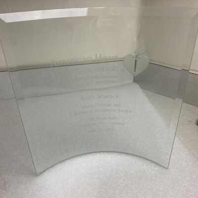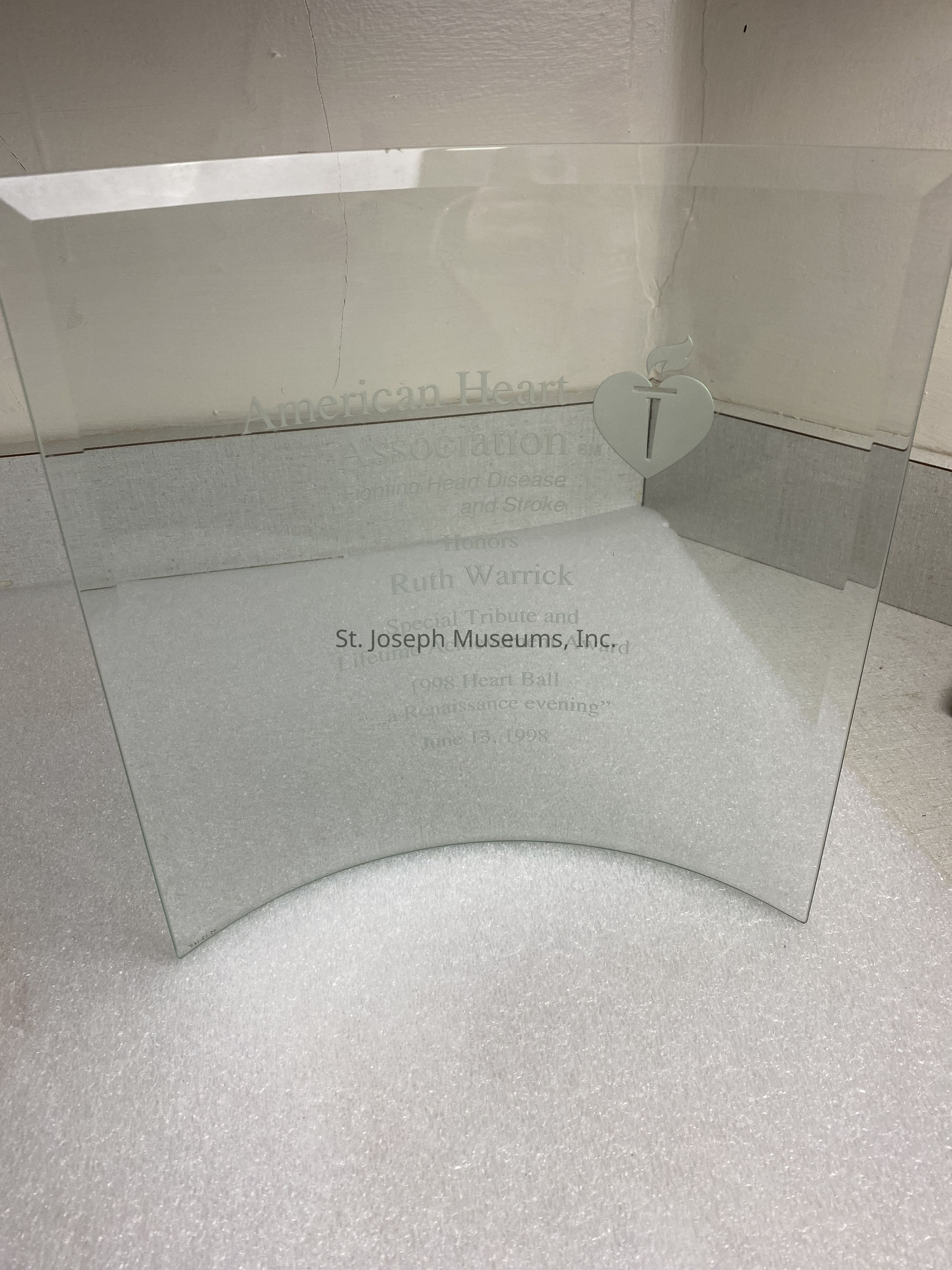 Award / Glass / Etched / "American Heart Association SM Fighting Heart Disease and Stroke Honors Ruth Warrick Special Tribute and Lifetime Achievement Award 1998 Heart Ball." / "...A Renaissance Evening June 13, 1998" 12" x 10 3/4" x 2 1/2"