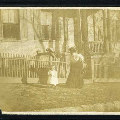 Nash, Rose and Marion: 1023 Main Street, Photo, c. 1910. Photo of young woman, Rose Nash at age 20 with toddler, Marion C, age 2. pictured on a brick sidewalk outside the fence of the home their home at 1023 Main Street. This is Marshall White's, the donor's, home in 2014. In 1910 it was the home of Arthur Nash. sepia photo matted on black cardboard.Collection