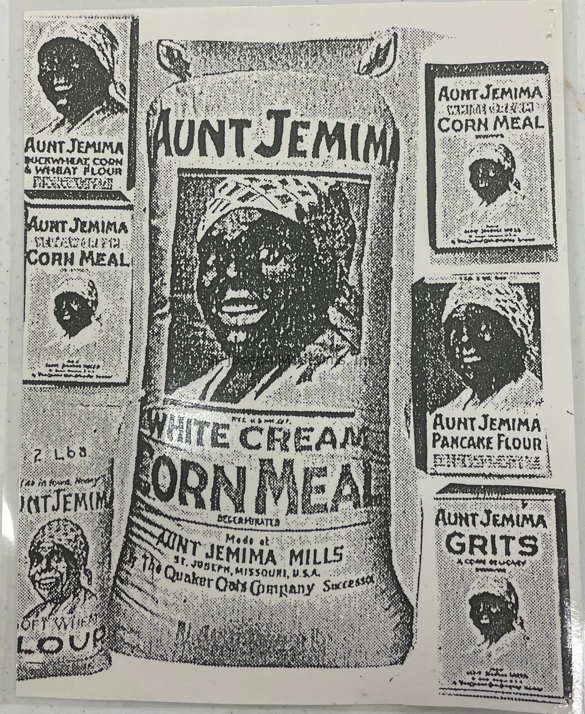 Advertisement for "Aunt Jemima White Cream Cornmeal" - Shows Aunt Jemima products, c. 1950.