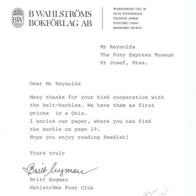 Files contain correspondence with Pony Rider descendants, Pony Express rider biographies, newspaper clippings related to the Pony Express, and miscellaneous records, photos, and documents collected from major private and University libraries among other sources. NOTE ABOUT ORIGIN OF LIBRARIES FILE. Prior to the opening of the renovated Pony Express Museum in 1993, St. Joseph Museum staff did extensive research on the Pony Express. All of the libraries in this folder were visited and copies of all material related to the Pony Express were made. This was done from 1991 to 1993. Information from this research was used in the new exhibits of the Pony Express Museum and in preparation of the book On the Winds of Destiny. In 2015, the file from the Pony Express Museum was added. Jackie Lewin 7/27/15 CD containing scans of actual documents found in Pony Express Research Files located in file cabinets in Document Storage II area.