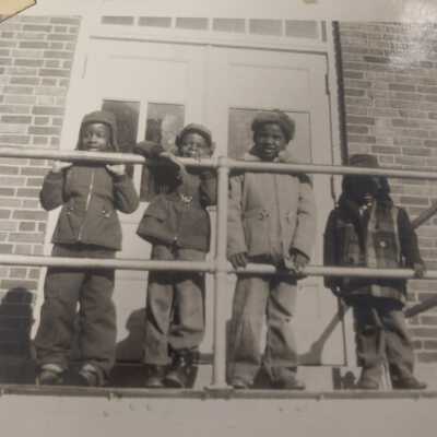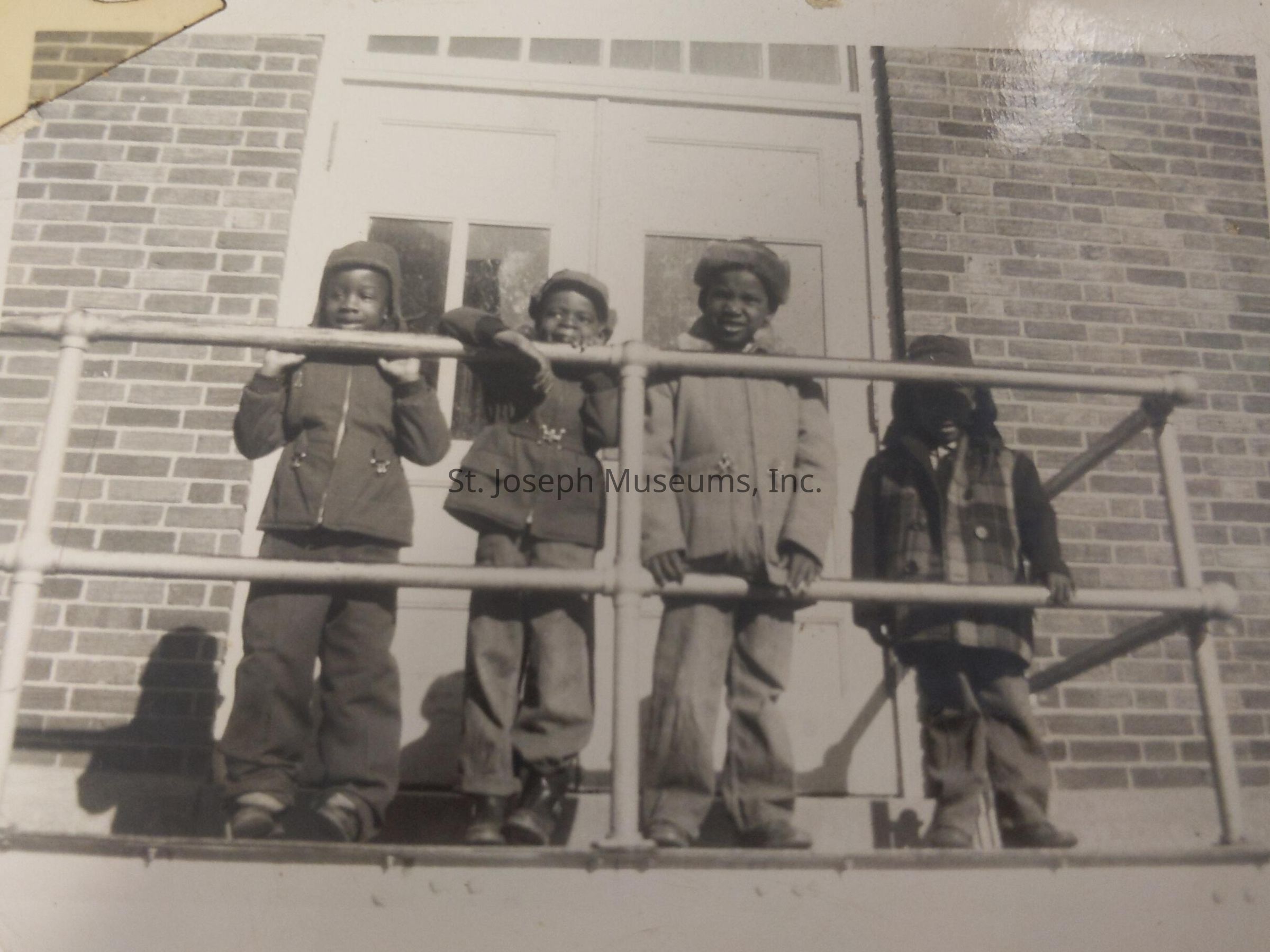 Photograph, black and white. Four children standing outside with jackets on in front of a doorway. Possibly Horace Mann School.