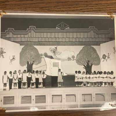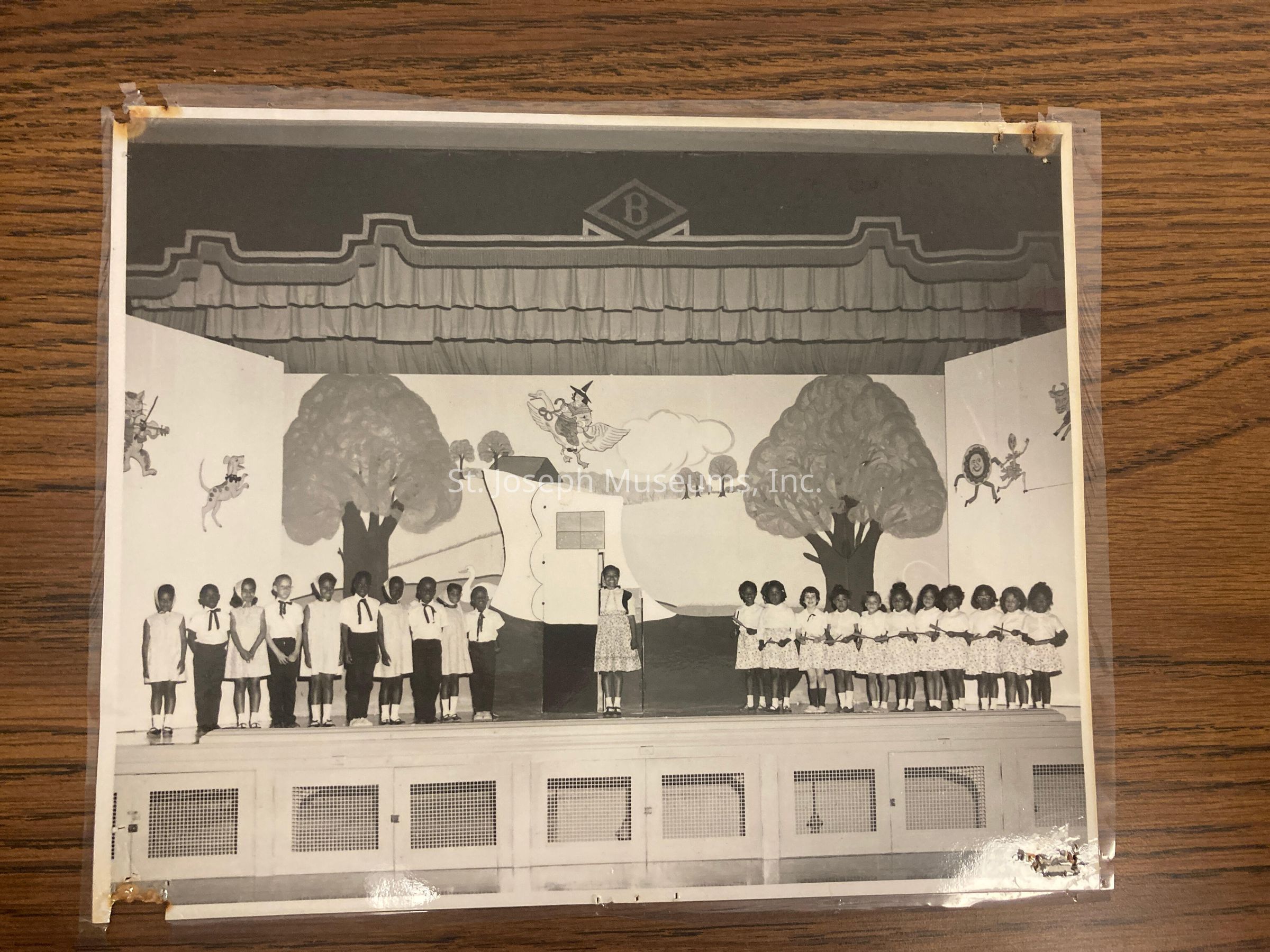 Horace Mann School Students' Performance Photo, 1967: Black & white photo - Horace Mann School students' performance on stage - 22 small children - On background Mother Goose, large shoe, cat & fiddle, trees - Laminated.Lexicon