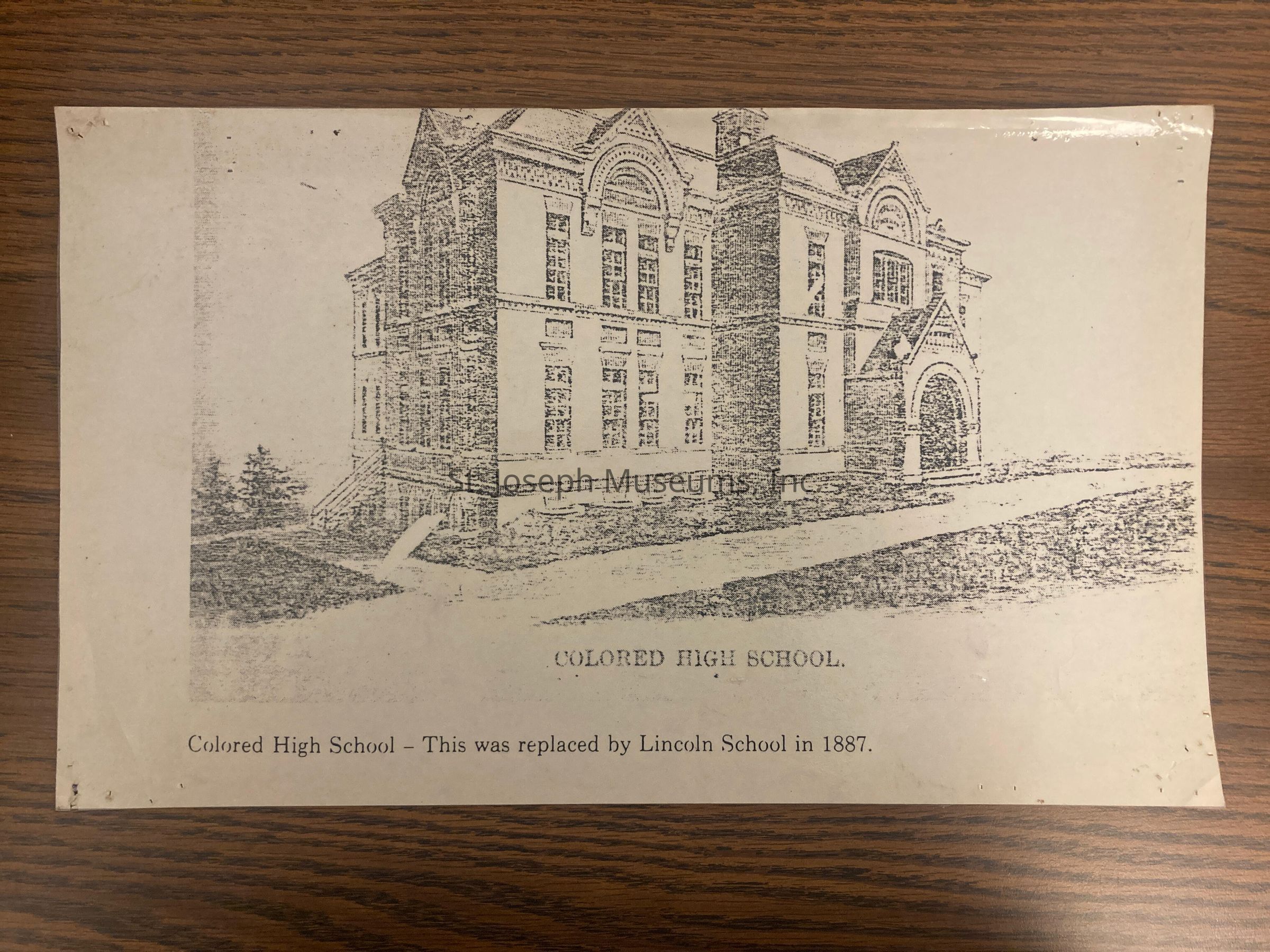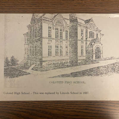 Colored High School Drawing - Black & white - Photocopy - "Colored High School" - Note says "Colored High School - This was replaced by Lincoln School in 1887" - Laminated.Lexicon