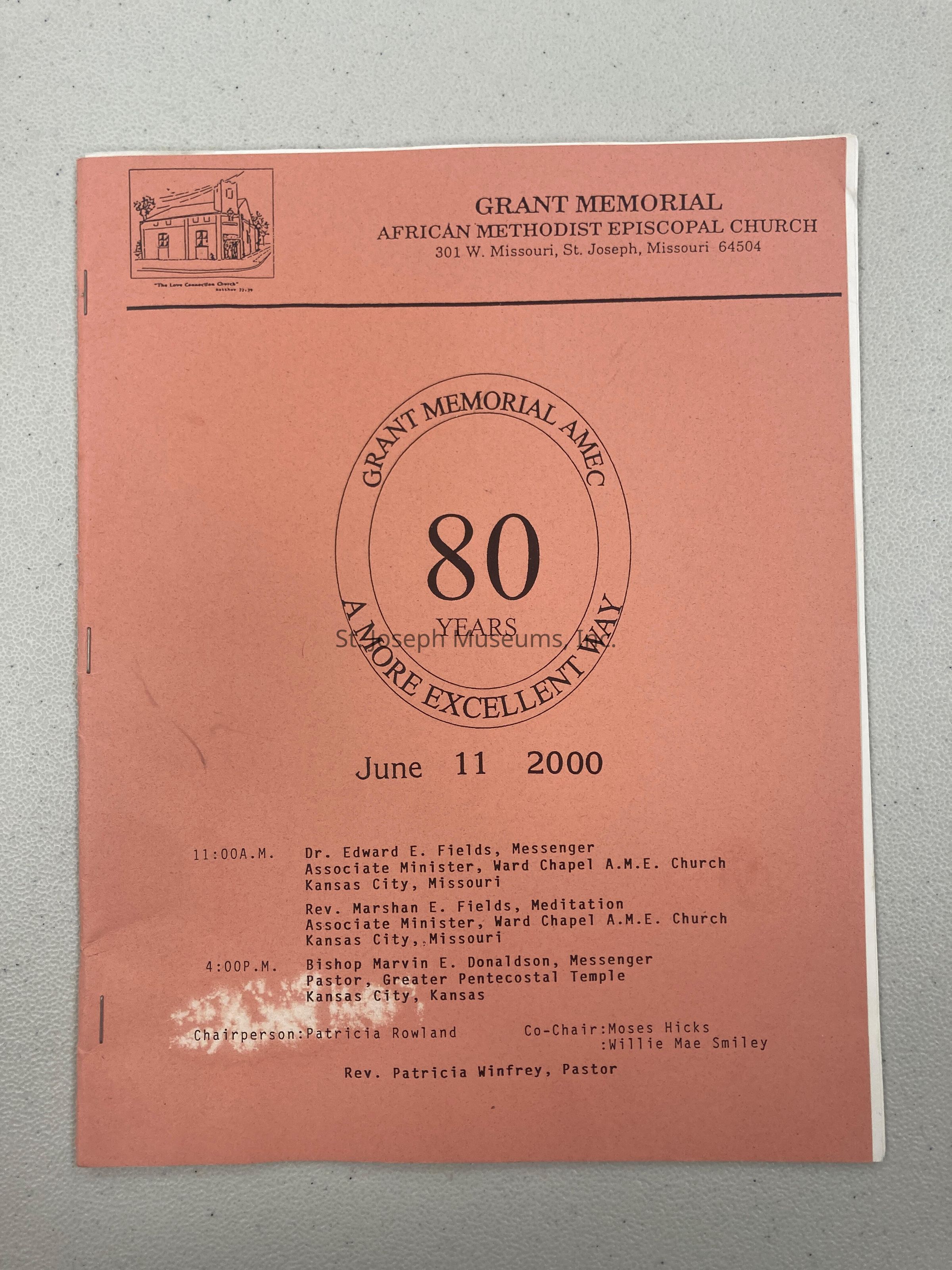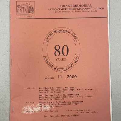 Grant Memorial African Methodist Episcopal, 301 W. Missouri, St. Joseph, MO. Church 80th Anniversary Program, June 11, 2000. Short outline of church history, including names of charter members, and pastors who served the church. Program of the days activities. List of current church officers, Advertisements from local merchants.Collection