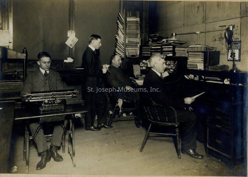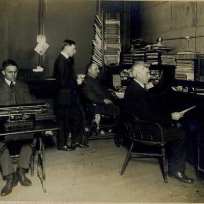 Plymouth Clothing Company Office Photo, 1915. Pictures 4 men in suits sitting at desks or typewriter in office setting. Plymouth Clothing Co. calendar on wall displays April 8, 1915.