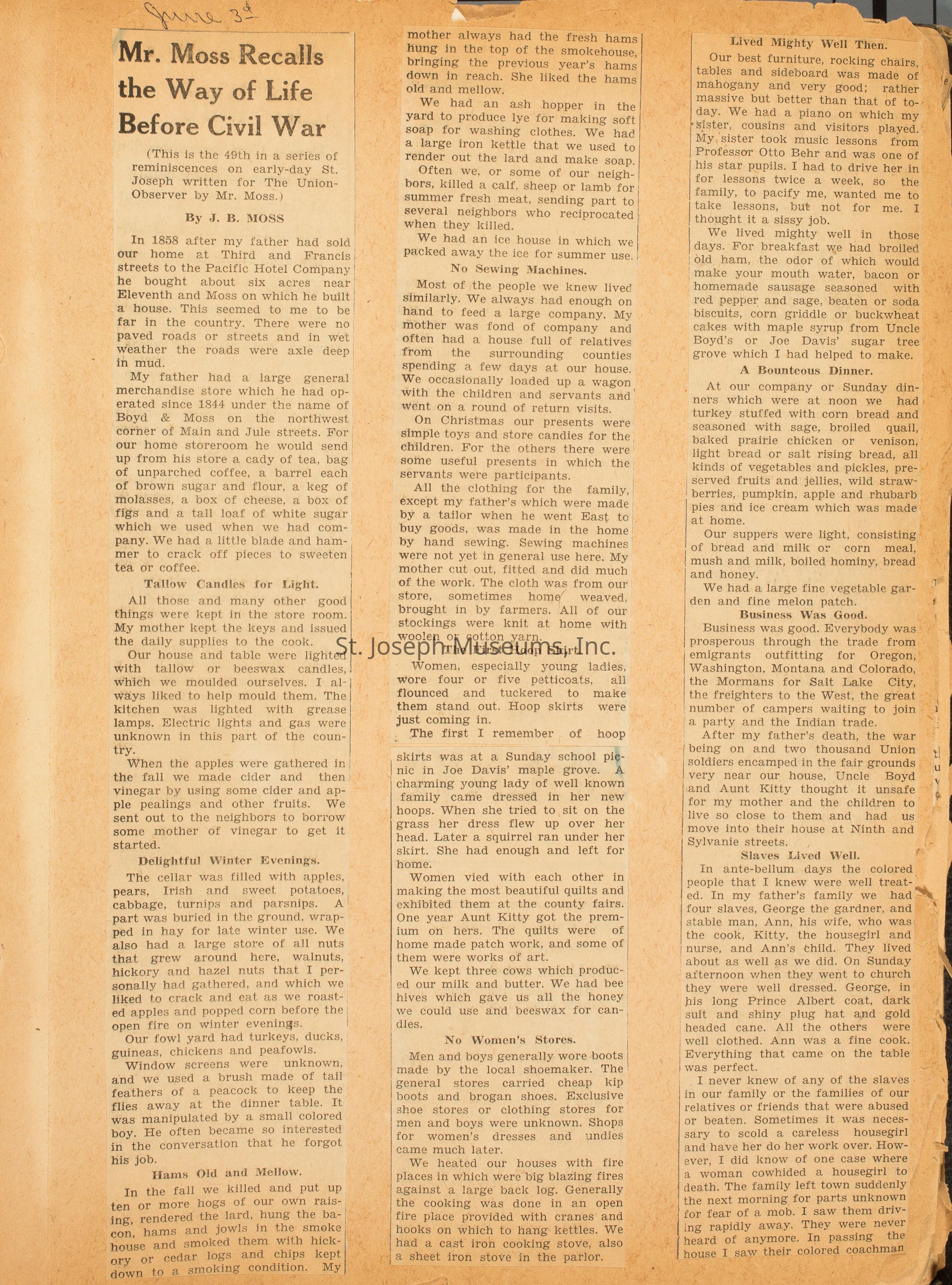 Two newspaper articles by J.B. Moss: Mr. Moss Recalls the Way of Life Before Civil War (June 3, 1938) The Story of a Pioneer Family is Told by Mr. Moss (June 10, 1938)