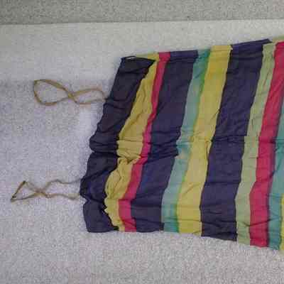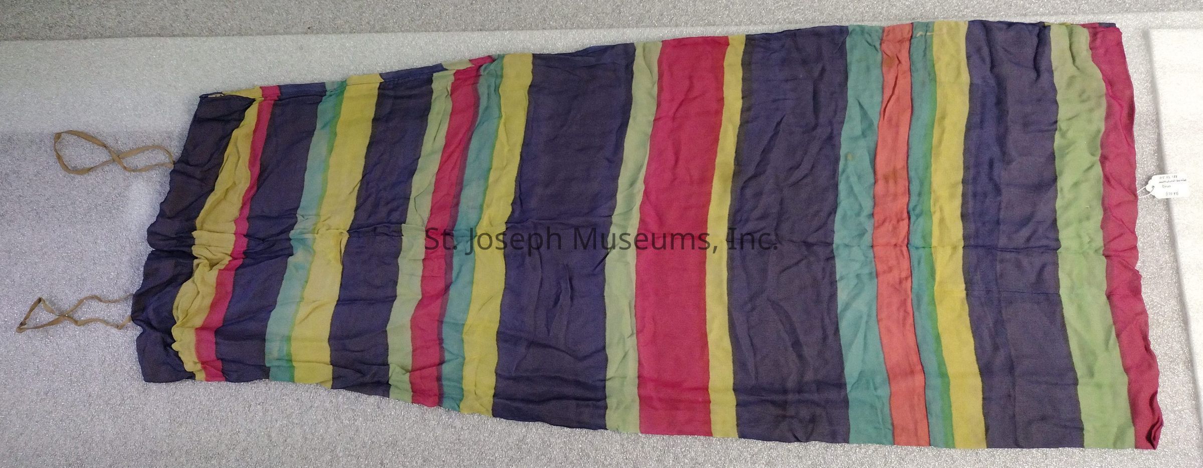 The image shows a colorful, striped dress, featuring alternating vertical bands of red, green, blue, and yellow. The fabric appears to be lightweight, and slightly wrinkled. The dress is sleeveless with two spaghetti straps.