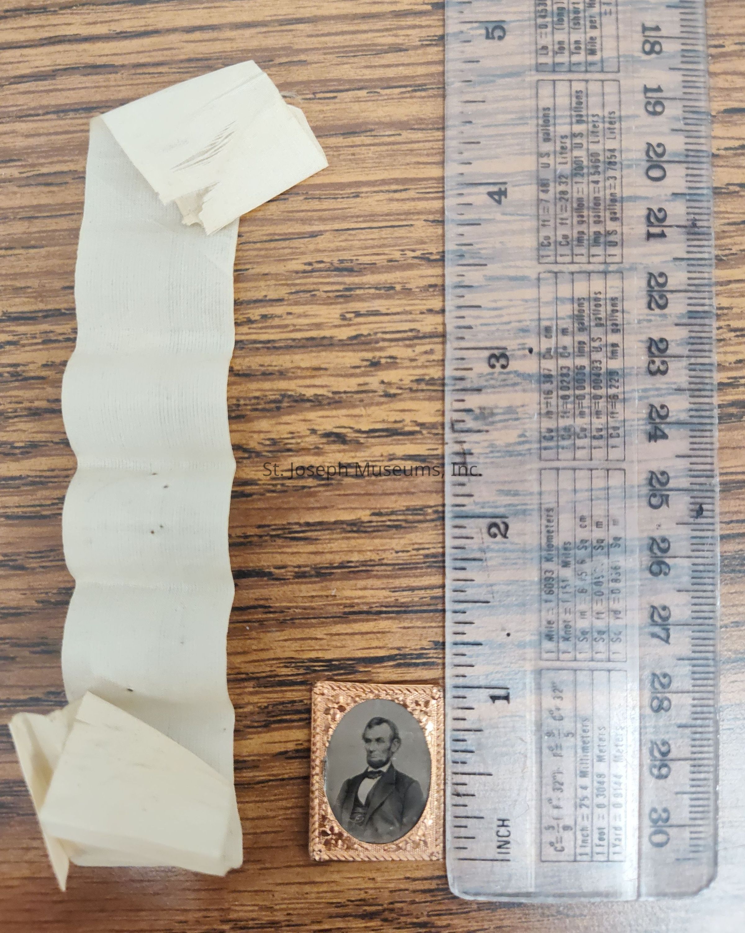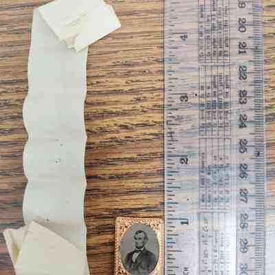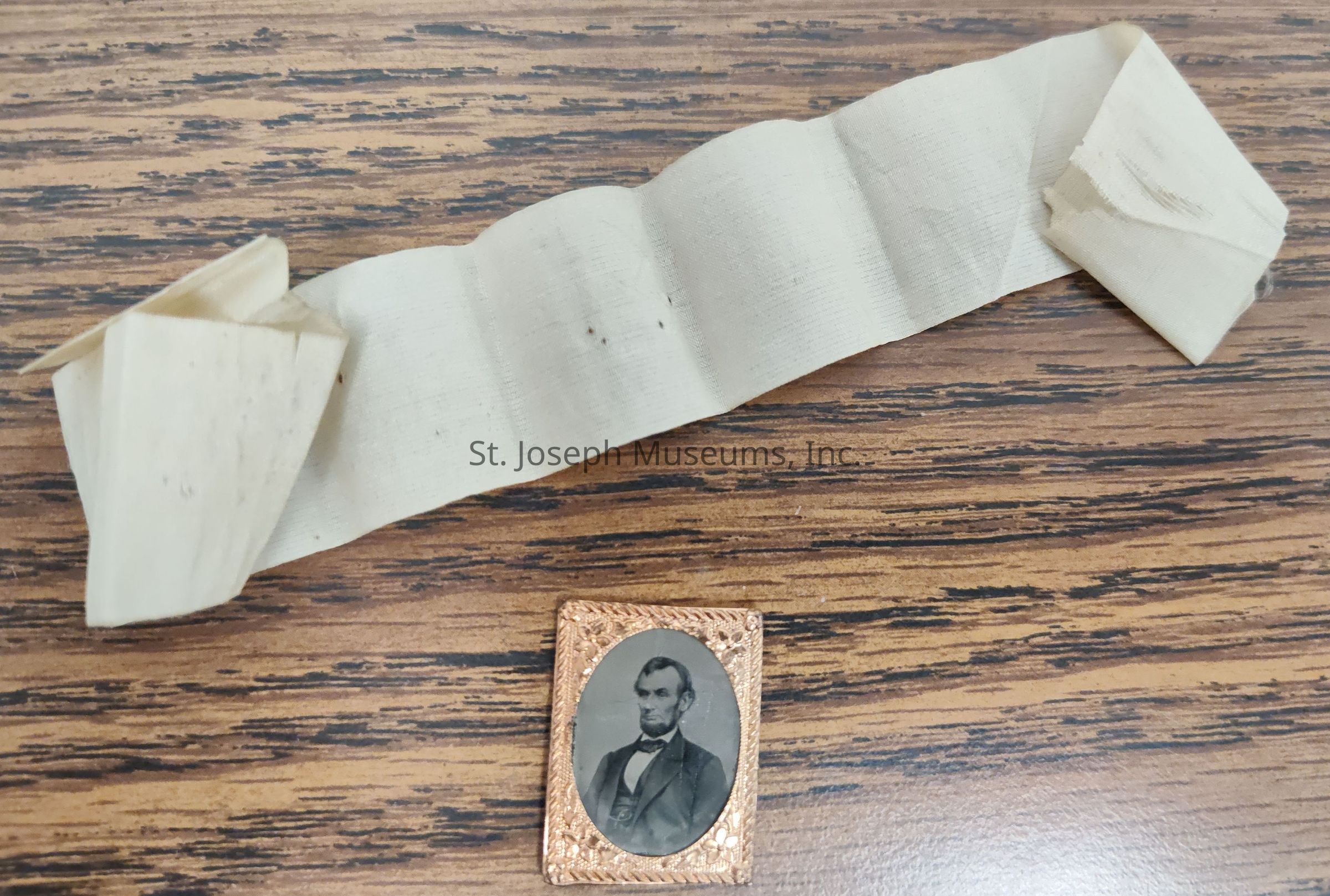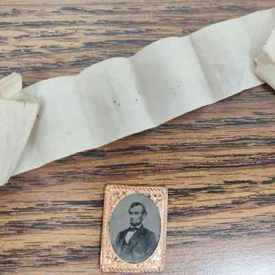 Small, sepia-toned portrait ofAbraham Lincoln encased in an ornate, rectangular, copper-colored frame with intricate designs, along with a beige, crumpled ribbon