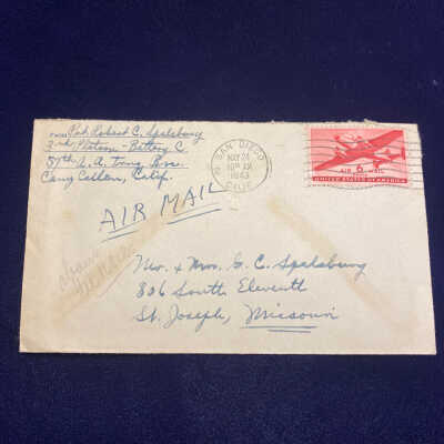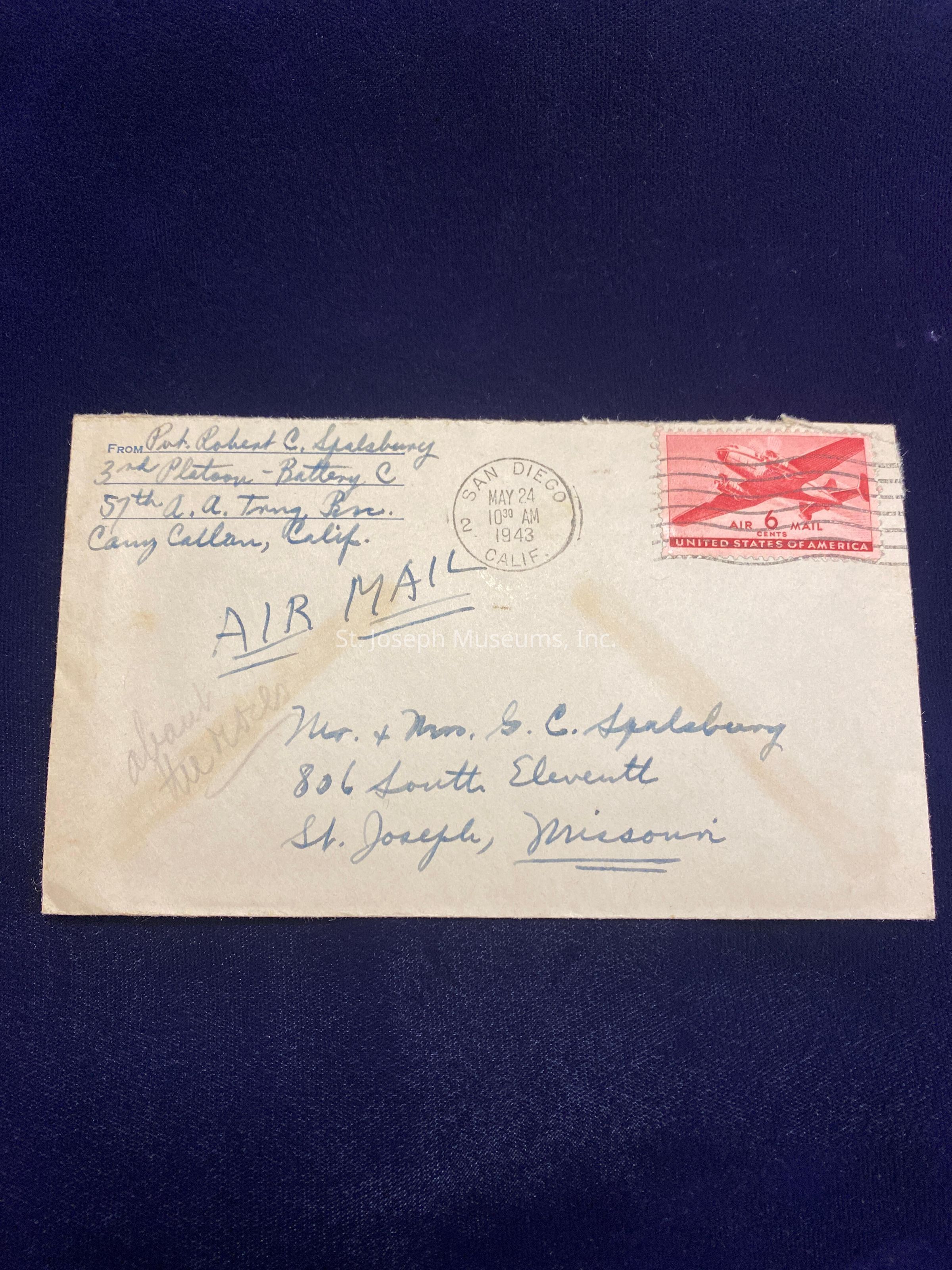 Letter Home from US Army Pvt. Robert C. Spalsbury, 3rd Platoon-Battery C, 57th A.A. Trng. Bn., Camp Callan, California to his parents, Mr. & Mrs. George C. Spalsbury, 806 South Eleventh Street, St. Joseph, Missouri - Postmarked May 24, 1943, 10:30 AM San Diego, CALIF, 6 cent Air Mail stampDescription