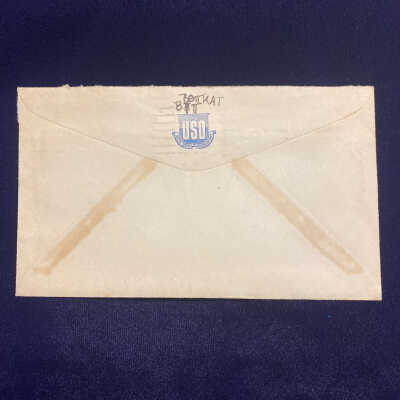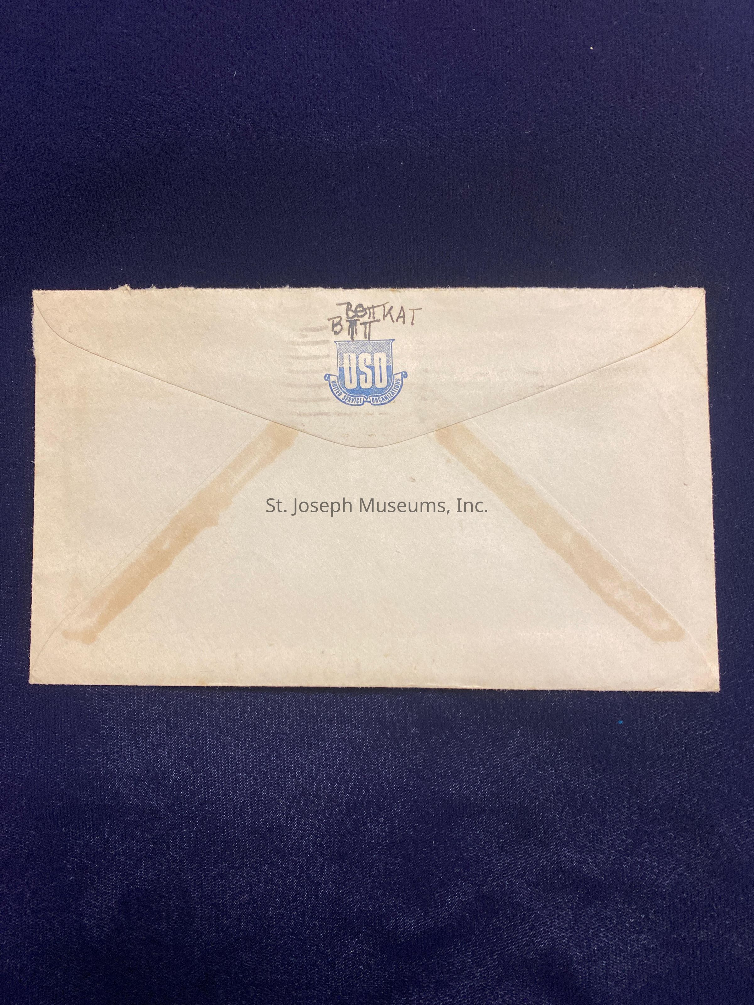 Handwritten letter home to parents back in St. Joseph after being called up to serve in the US Army during WWII. Pvt. Spalsbury, at the time of this letter, is at Camp Callen, California for Basic Training. The letter is two pages, front & back, written in ink pen on plain Air Mail stationery, with pencil sketch of flower garden on the final page. The envelope specifies Via Air Mail. A USO (United Service Organization) logo is on the back of the envelope. Above the USO logo, Robert has written a few symbols/characters/letters.Condition