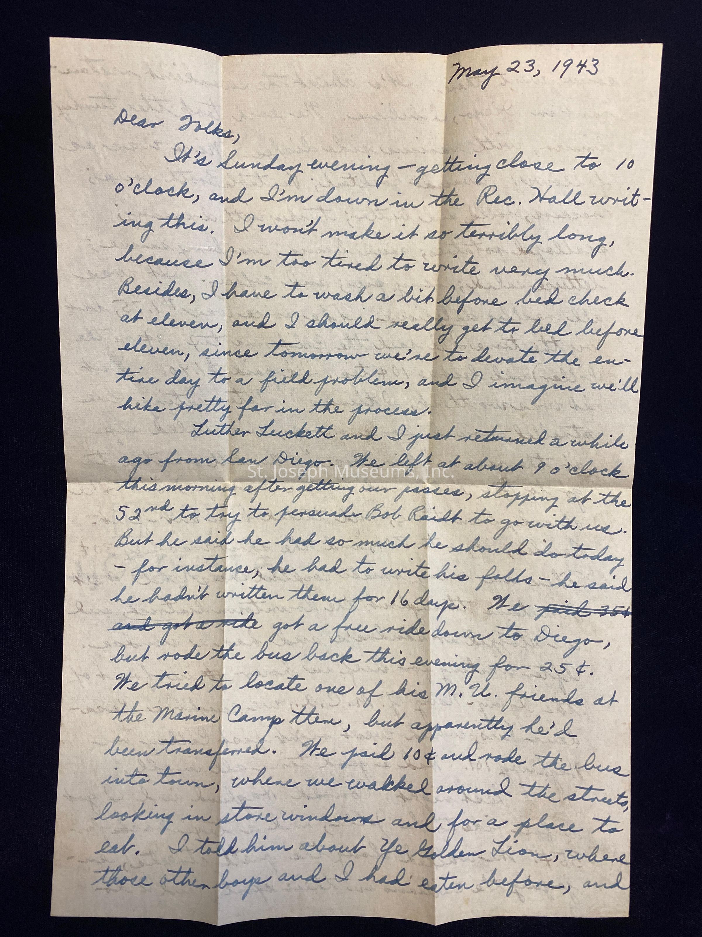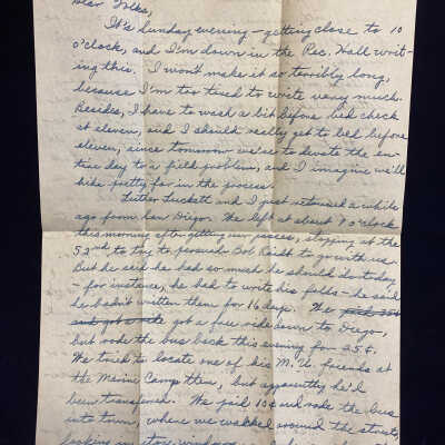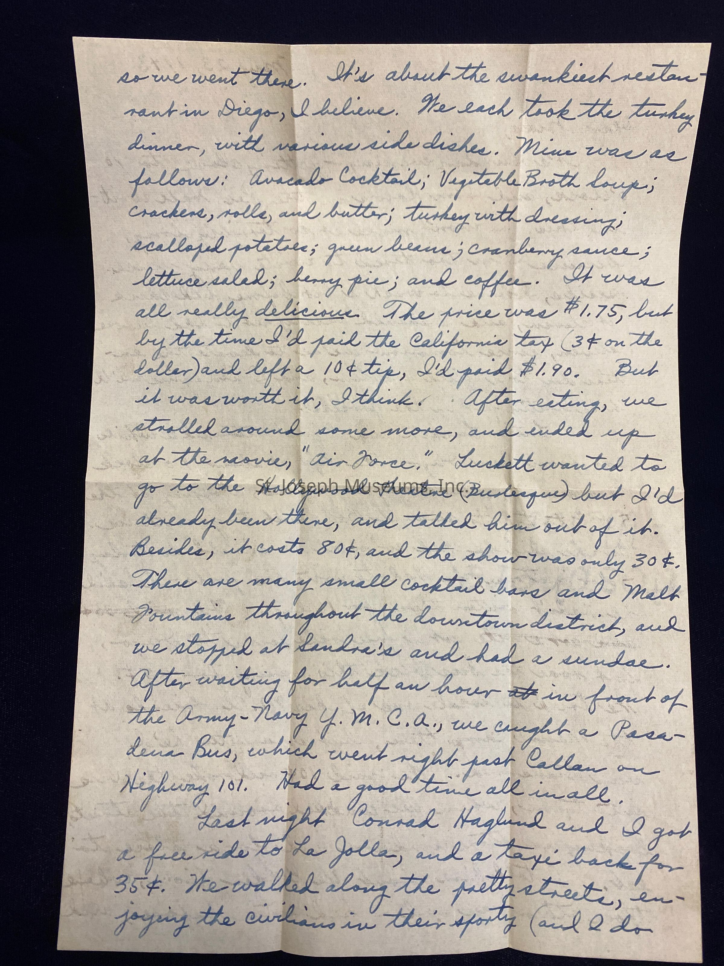 Luther Luckett and I just returned a while ago from San Diego. We left at about 9 o'clock this morning after getting our passes, stopping at the 52nd to try to persuade Bob Raidt to go with us. But he said he had so much he should do today - for instance, he had to write his folks - he said he hadn't written them for 16 days. We got a free ride down to Diego, but rode the bus back this evening for 25 cents. We tried to locate one of his M.U. friends at the Marine Camp there, but apparently he'd been transferred. We paid 10 cents and rode the bus into town, where we walked around the streets, looking in store windows and for a place to eat. I told him about Ye Golden Lion, where those other boys and I had eaten before, and so we went there. It's about the swankiest restaurant in Diego, I believe. We each took the turkey dinner, with various side dishes. Mine was as follows: Avacado Cocktail; Vegetable Broth soup; cracker, rolls, and butter; turkey with dressing; scalloped potatoes; green beans; cranberry sauce; lettuce salad; berry pie; and coffee. It was all really delicious. The price was $1.75, but by the time I'd paid the California tax (3 cents on the dollar) and left a 10 cent tip, I'd paid $1.90. But it was worth it, I think. After eating, we strolled around some more, and ended up at the movie, "Air Force." Luckett wanted to go to the Hollywood Theatre (Burlesque) but I'd already been there, and talked him out of it. Besides, it costs 80 cents, and the show was only 30 cents. There are many small cocktail bars and Malt Fountains throughout the downtown district, and we stopped at Sandra's and had a sundae. After waiting for half an hour in front of the Army-Navy Y.M.C.A., we caught a Pasadena Bus, which went right past Callan on Highway 101. Had a good time all in all.