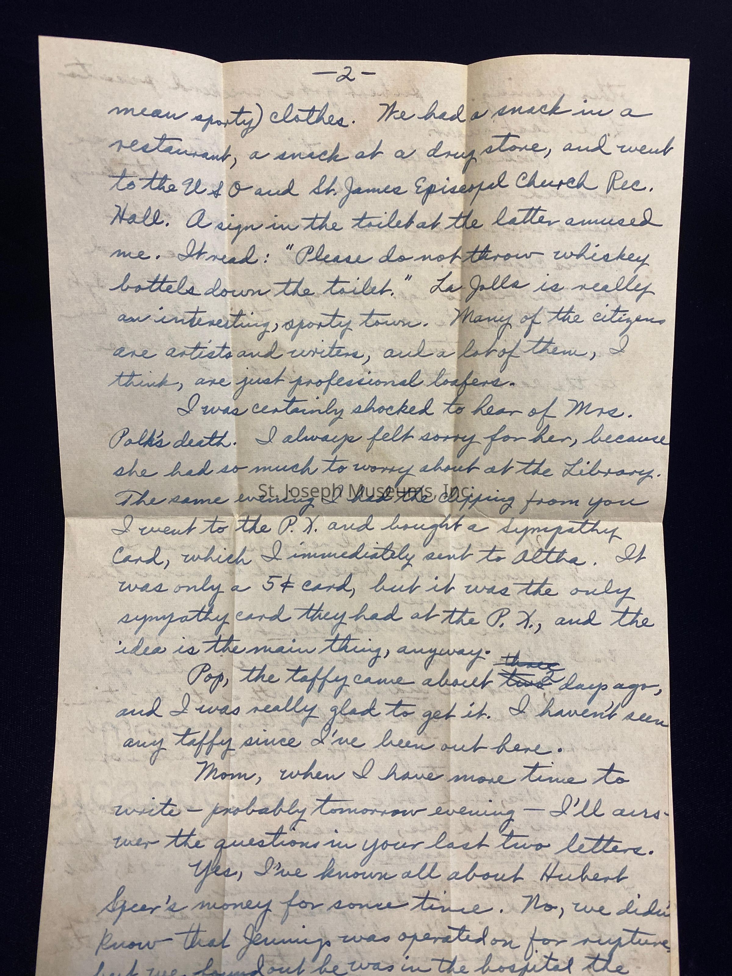 Last night Conrad Haglund and I got a free ride to La Jolla, and a taxi back for 35 cents. We walked along the pretty streets, enjoying the civilians in their sporty (and I do mean sporty) clothes. We had a snack in a restaurant, a snack at a drug store, and went to the USO and St. James Episcopal Church Rec. Hall. A sign in the toilet at the latter amused me. It read: "Please do not throw whiskey bottels down the toilet." La Jolla is really an interesting, sporty town. Many of the citizens are artists and writers, and a lot of them, i think, are just professional loafers.