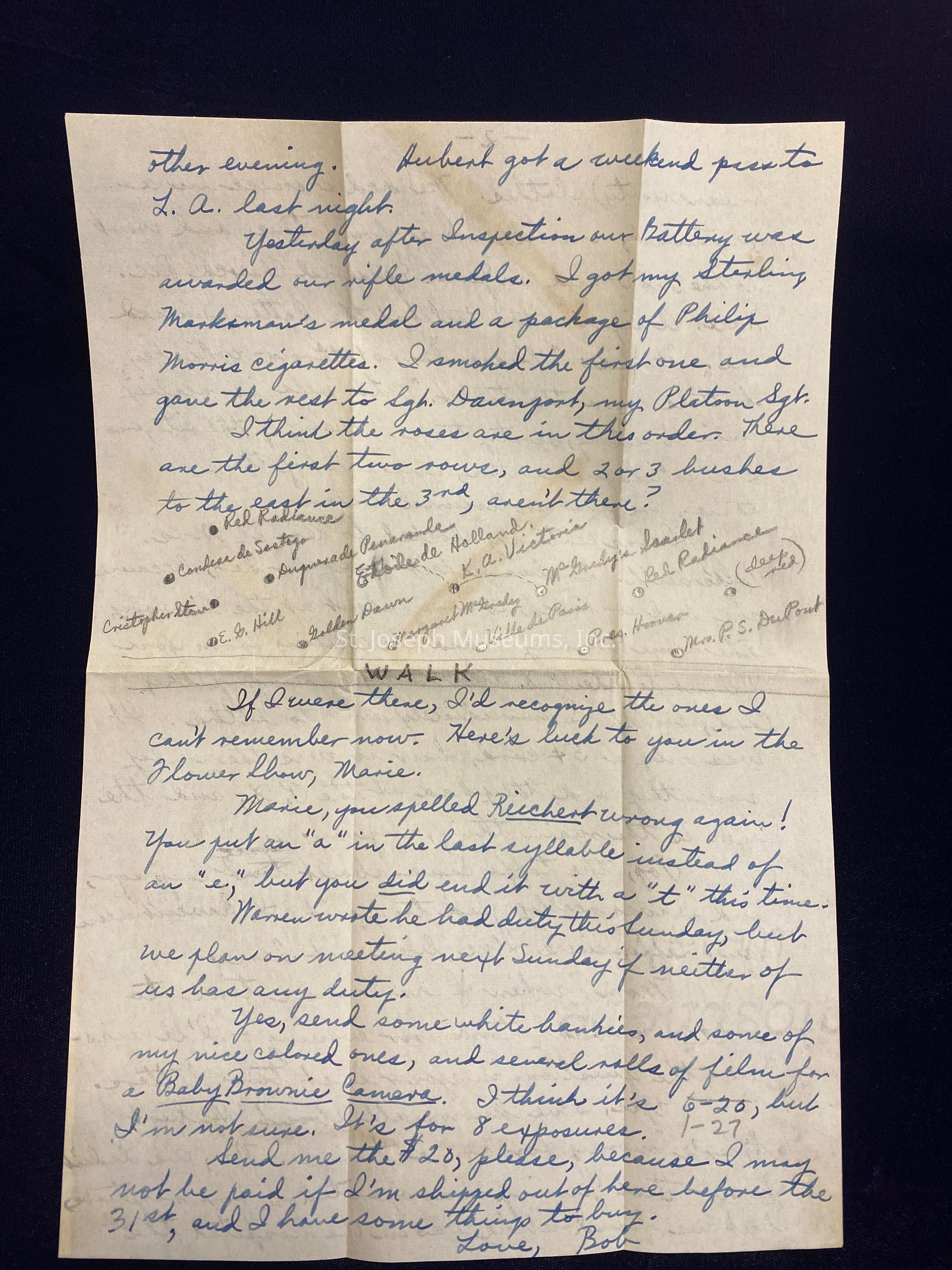 [NOTE: look to images of letter to see where Robert sketched in pencil the names and location of roses from their yard in relation to the walk]