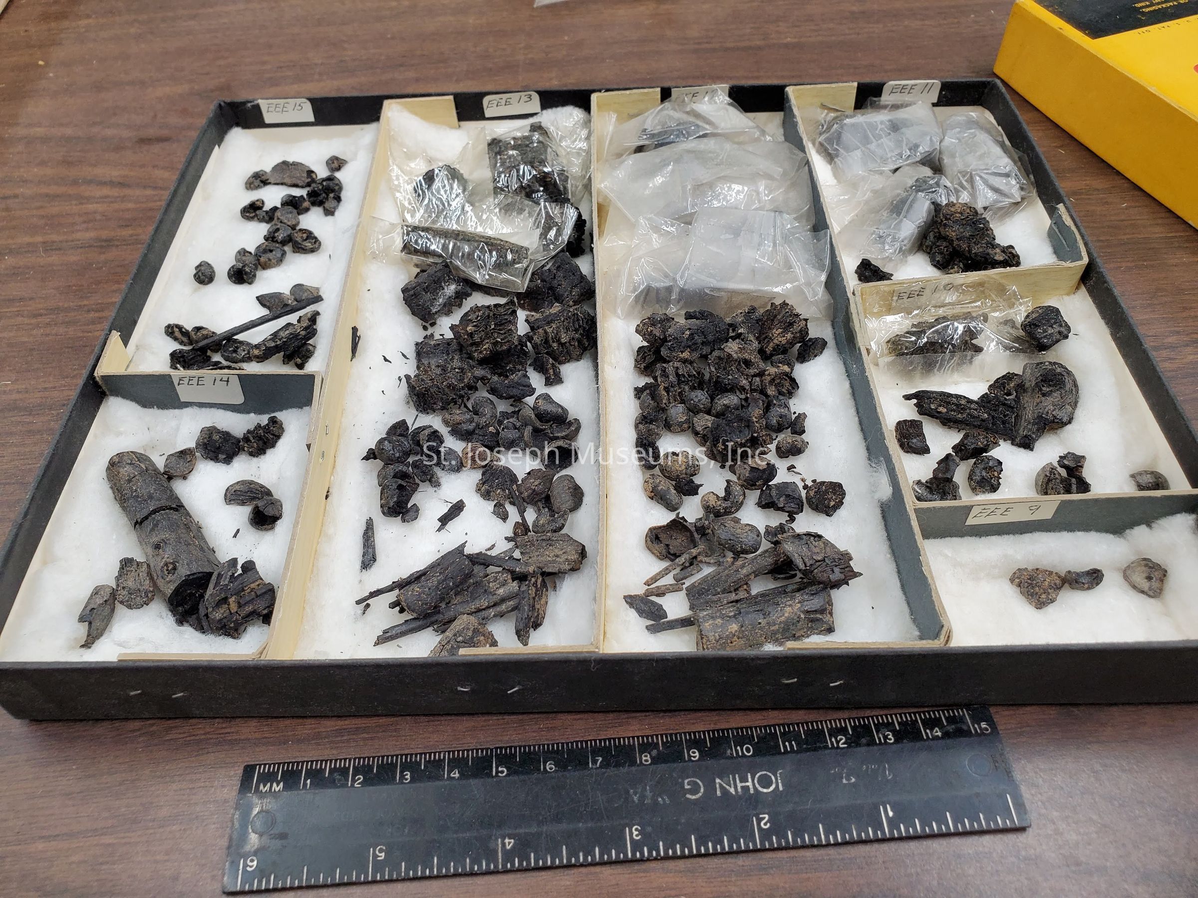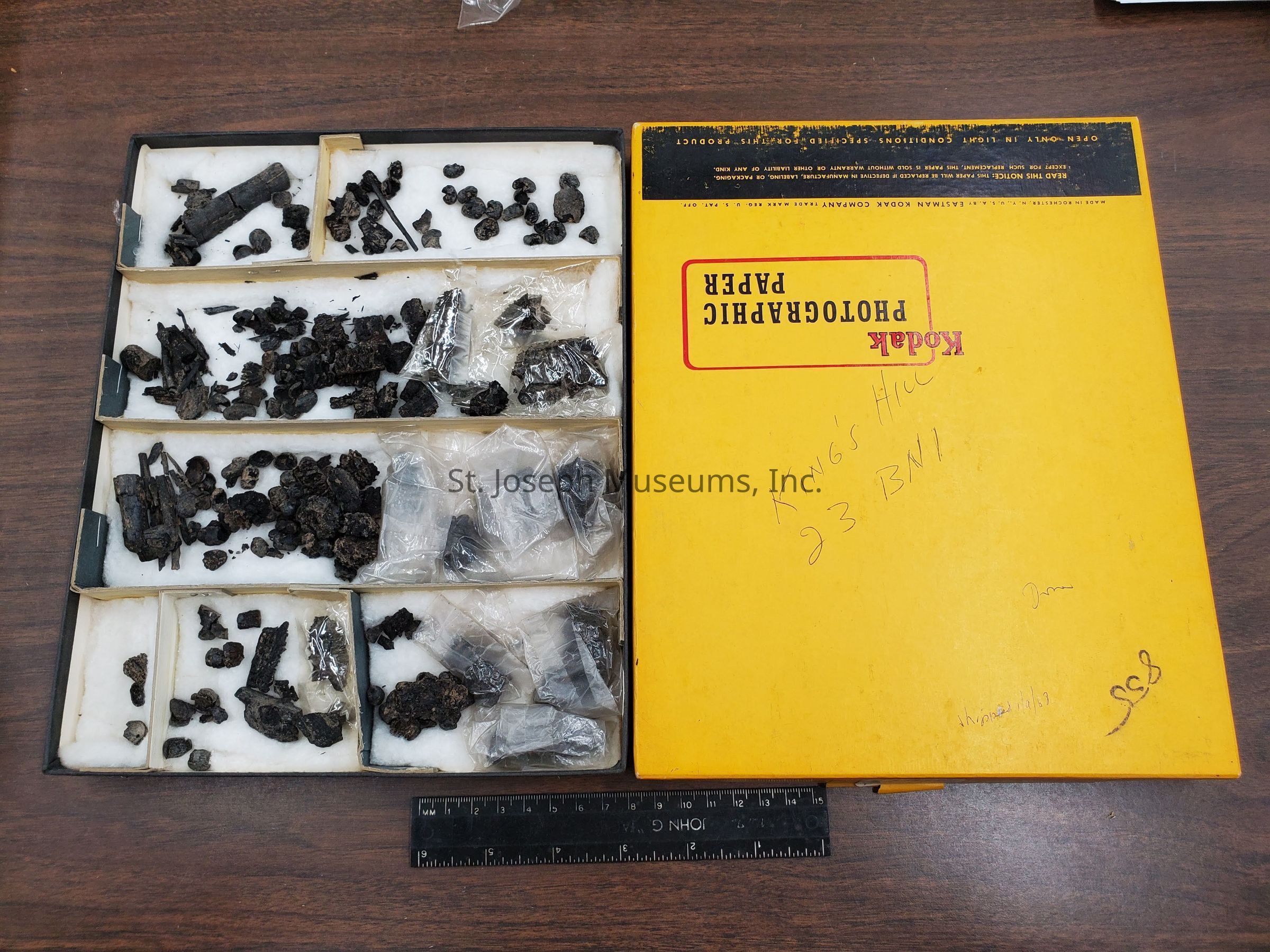 23BN1 SQ. EEE L. 9 THRV 15 1 Box of Charred Botanical Remains Count 1 box Box reads: King's Hill 23BN1 Done Shipped 1/9/68 EEE 9 through 15
