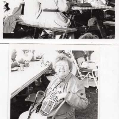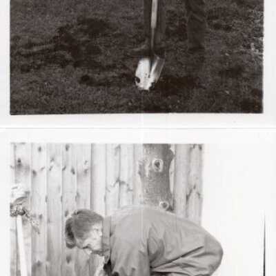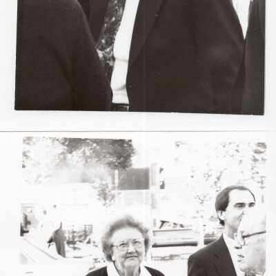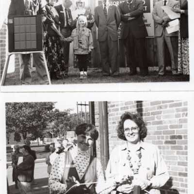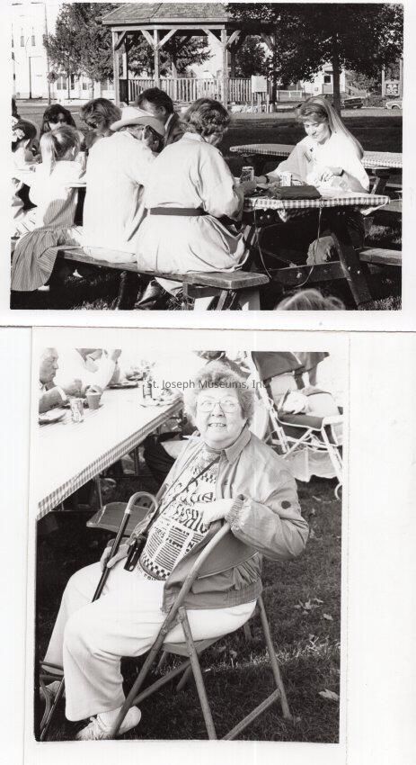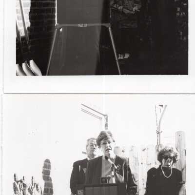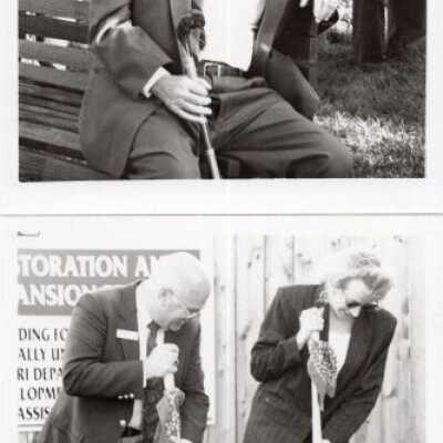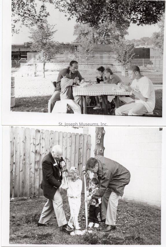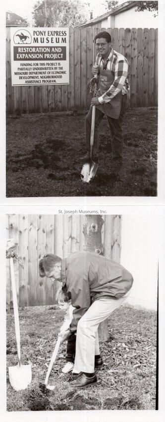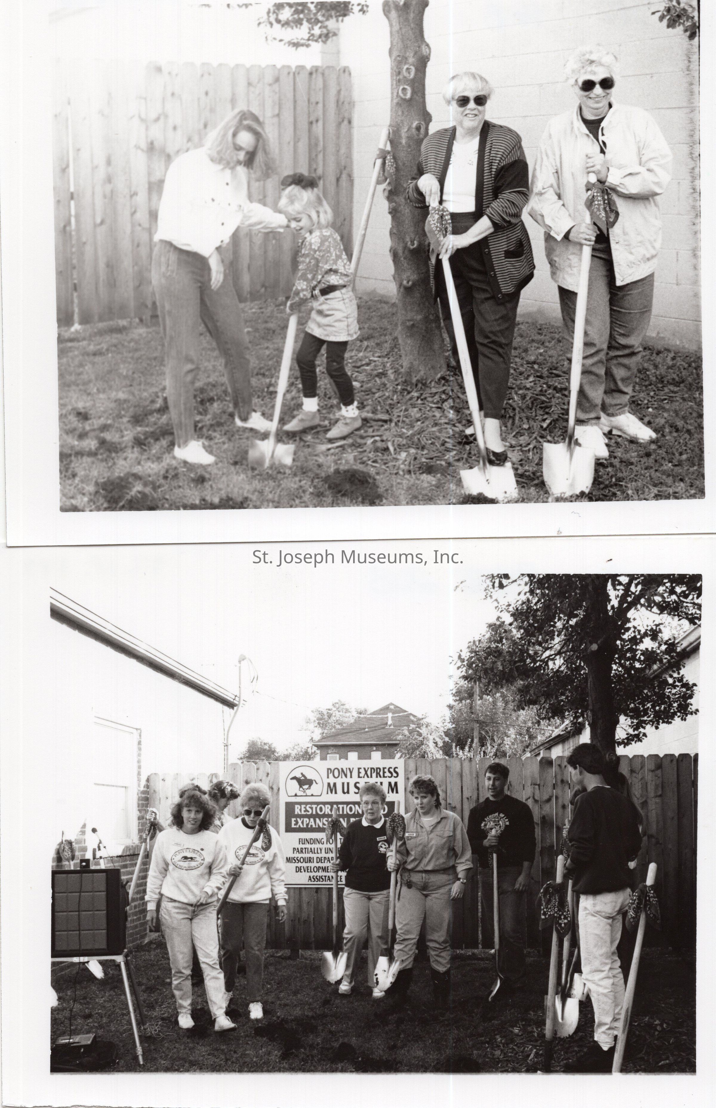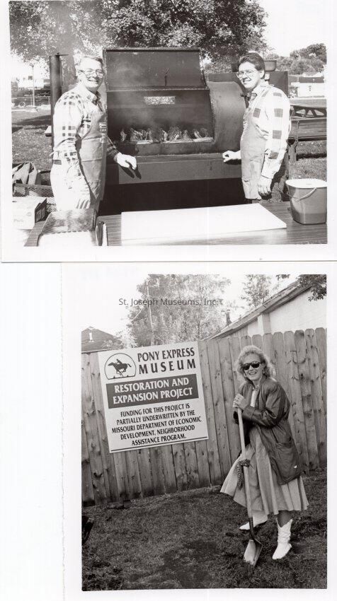 Groundbreaking, Pony Express Museum Expansion, Photos (56), Sept. 1992. b/w. Snapshots taken at the groundbreaking ceremonies for the expansion of the Pony Express Museum into the Pony Express National Memorial. Photos shows groups of persons breaking ground with shovel., barbecue picnic in Patee Park, and groups of people who attended.