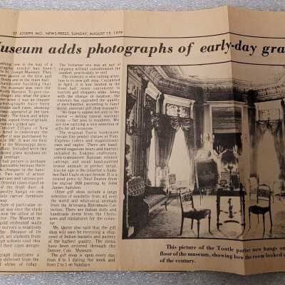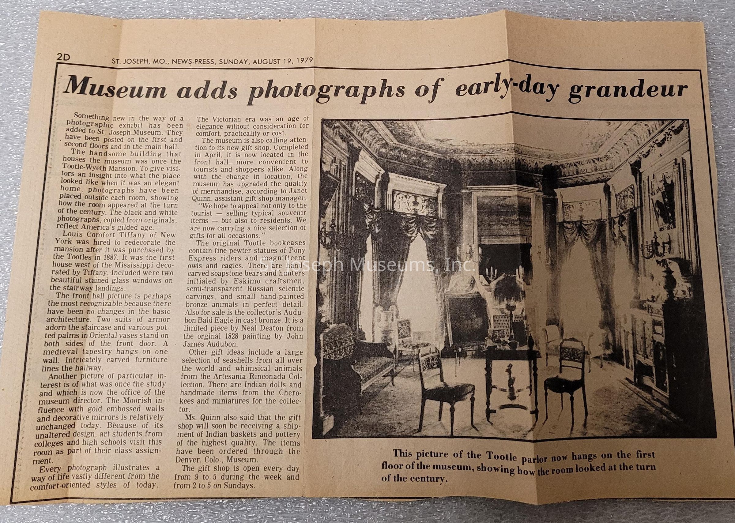 A newspaper article from the St. Joseph News-Press on Sunday, August 19, 1979 about the St. Joseph Museum adding a photographic exhibit, reflecting the Gilded Age at the Wyeth-Tootle Mansion.