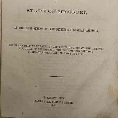 Journal of the House of Representatives of the State of Missouri covers the first session of the Nineteenth General Assembly in Jefferson City, MO on Monday, December 29, 1856. The book is in very poor condition with no front cover. The pages are yellowing and stained. 500/Hardbound.