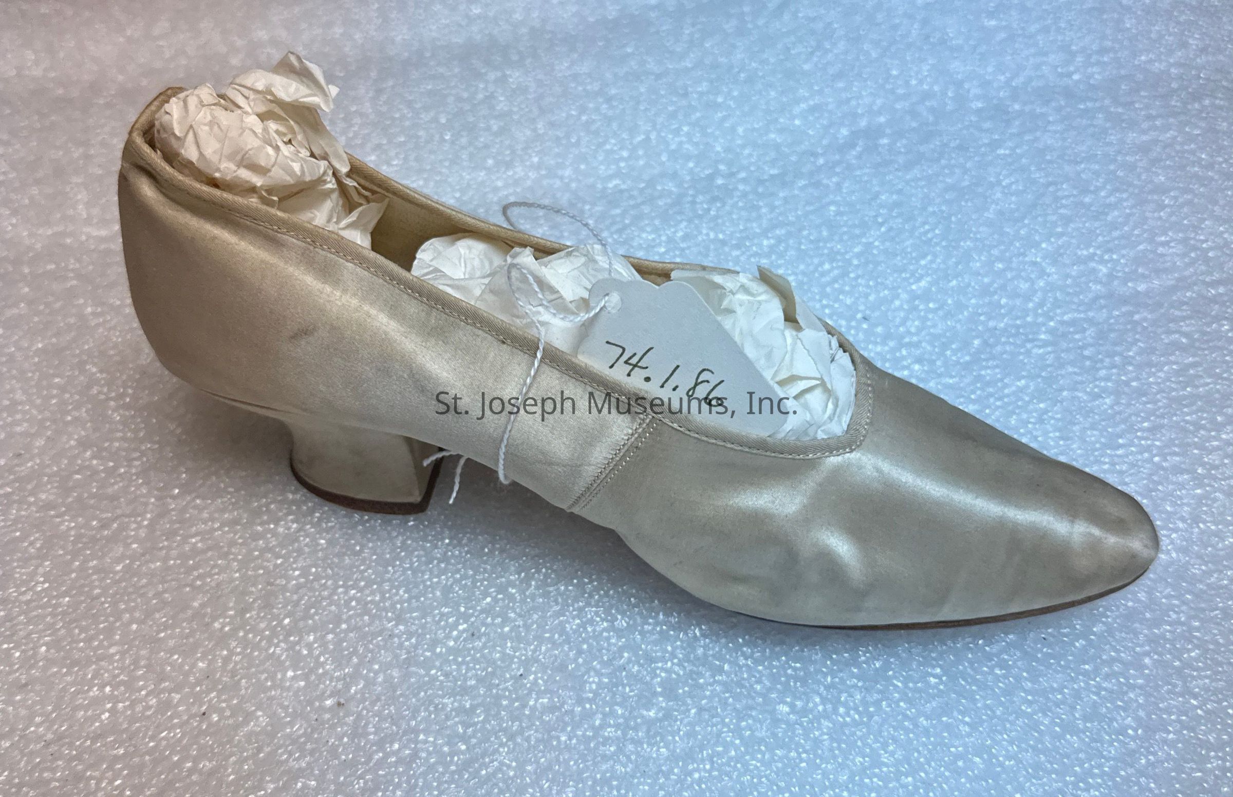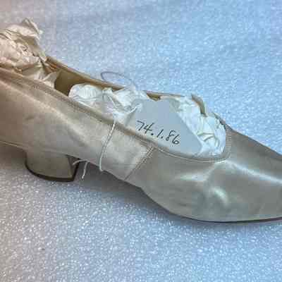 The image features a single white satin slipper with a low heel.