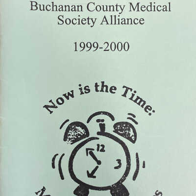 Buchanan County Medical Society Alliance, 'Now is the Time, Make Healthy Choices' 1999-2000. A light green cover with black lettering. An old fashioned alarm clock in the middle.