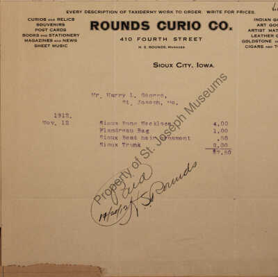 Rounds Curio Co. H.S. Rounds Sioux City, Iowa Invoice dated Nov 12, 1912 Item #1