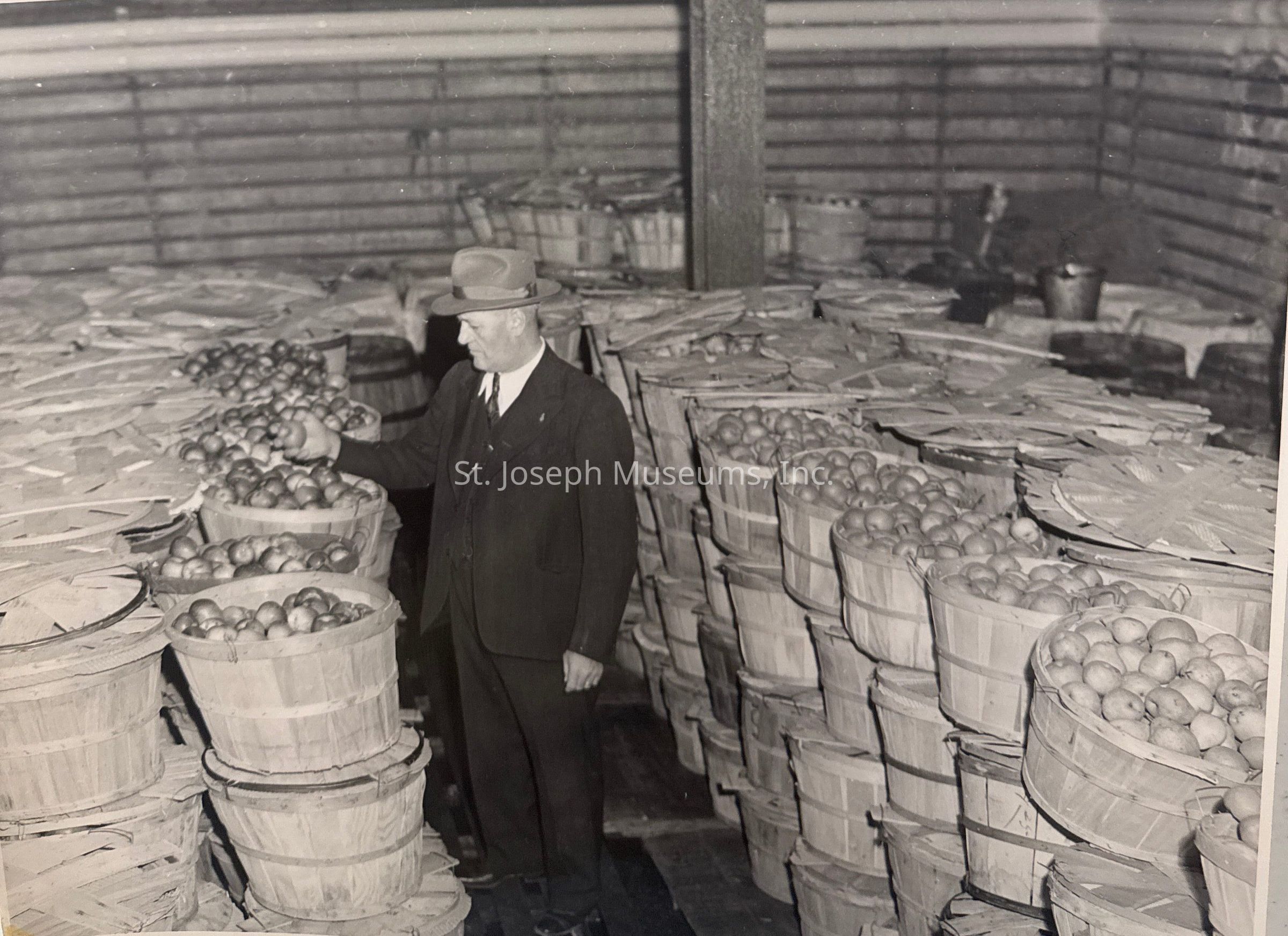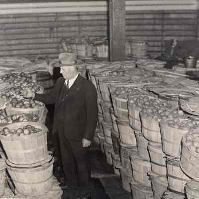 Apple Storage, St. Joseph State Hospital No. 2, undated. Apples in cooler storage at State Hospital No. 2 St. Joseph Mo., being examined by the hospital's steward S. J. Shepherd. Unknown year.Collection