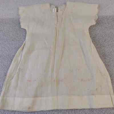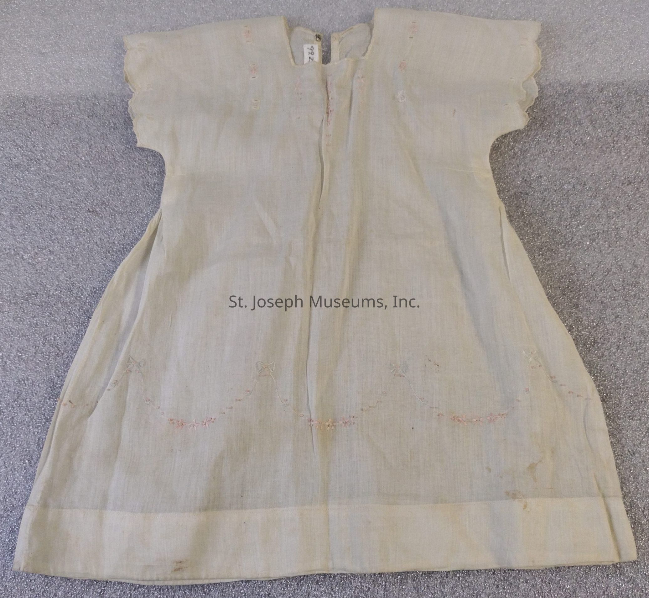 Cotton dress/child's/small pink flowers/blue bows at bottom/square neckline/snap closure/c. 1900