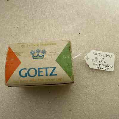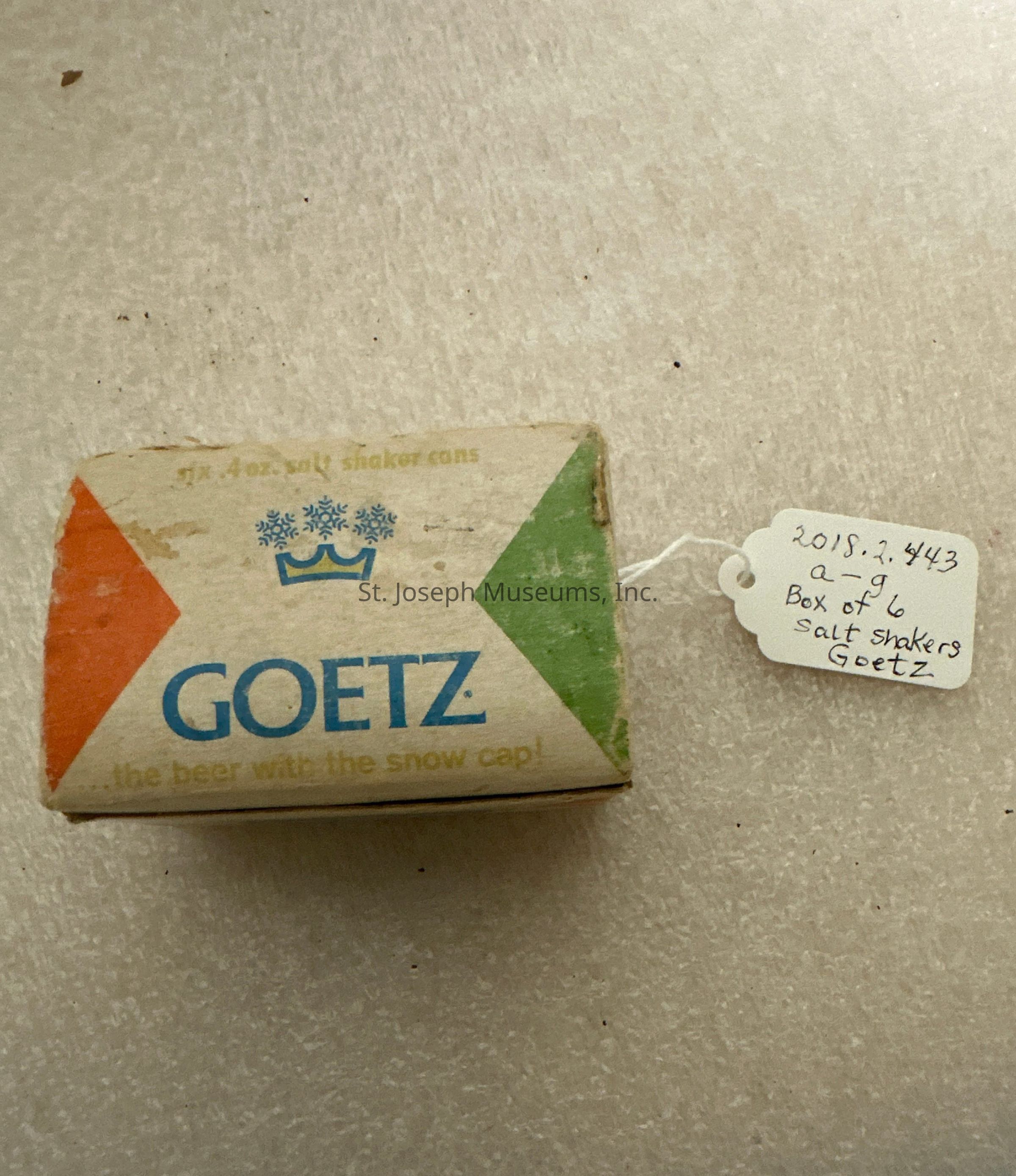 One Goetz off-white box containing 6 - .04 oz salt shakers, all marked with the name. Box colors are blue, with orange and green on each long side.