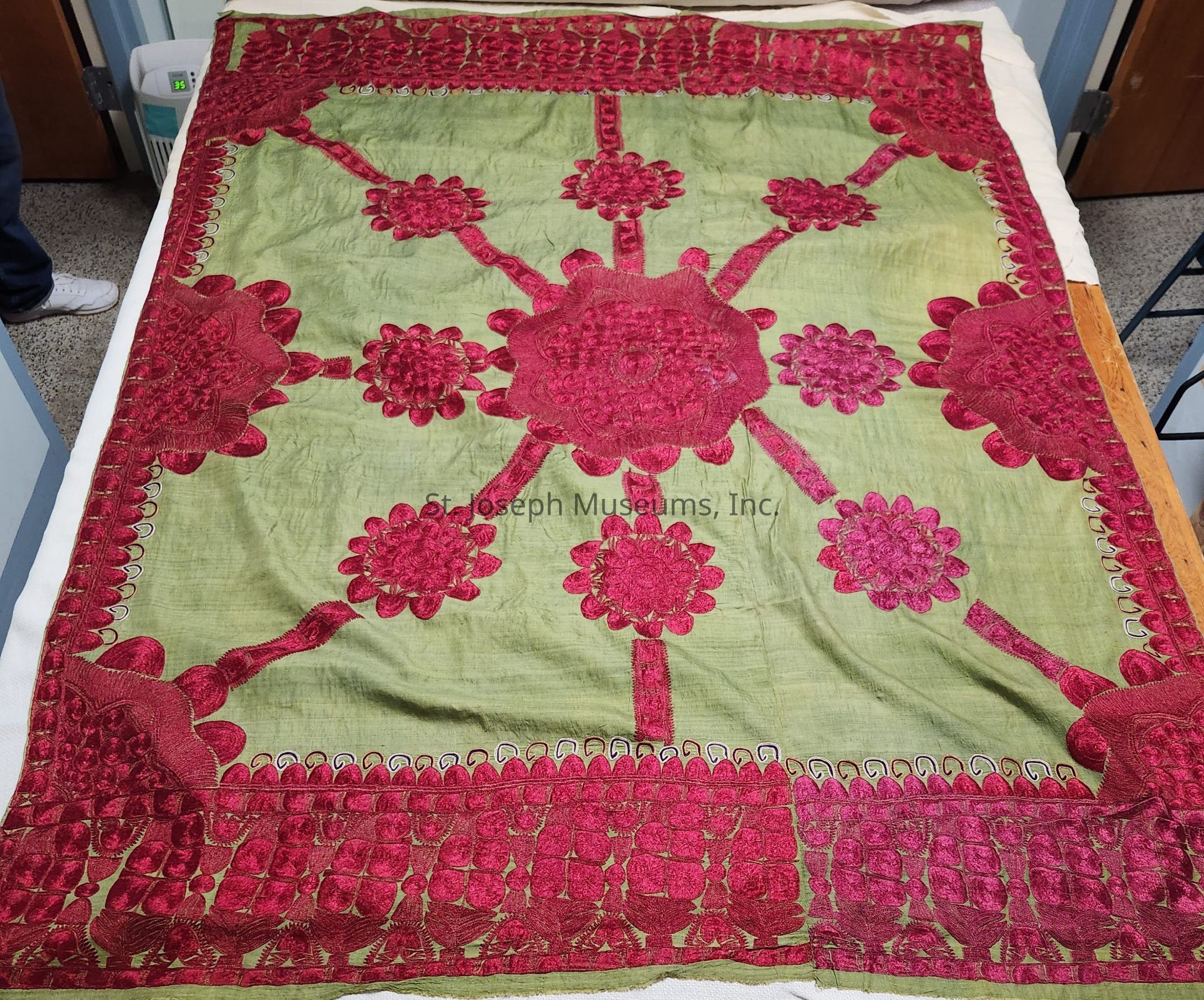 TABLE COVER OR WALL HANGING/TAPESTRYGREEN SILK WITH RED EMB./ POSSIBLY MRS. K. V. PAINTER