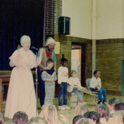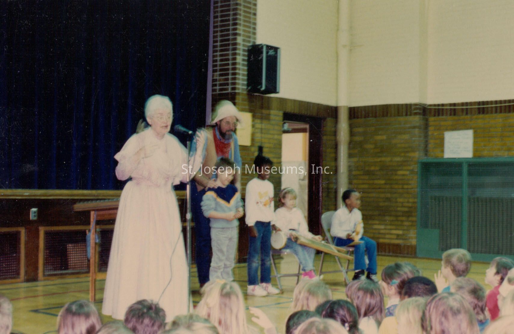 96.1P.159 = Esther Kreek, dressed in period clothes, speaks to children seated on gym floor. Storyteller with hands on shoulders of student behind her.