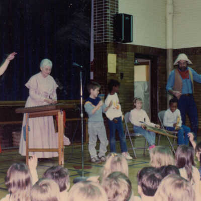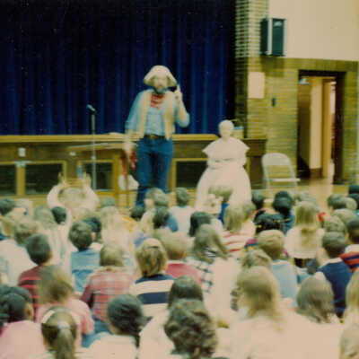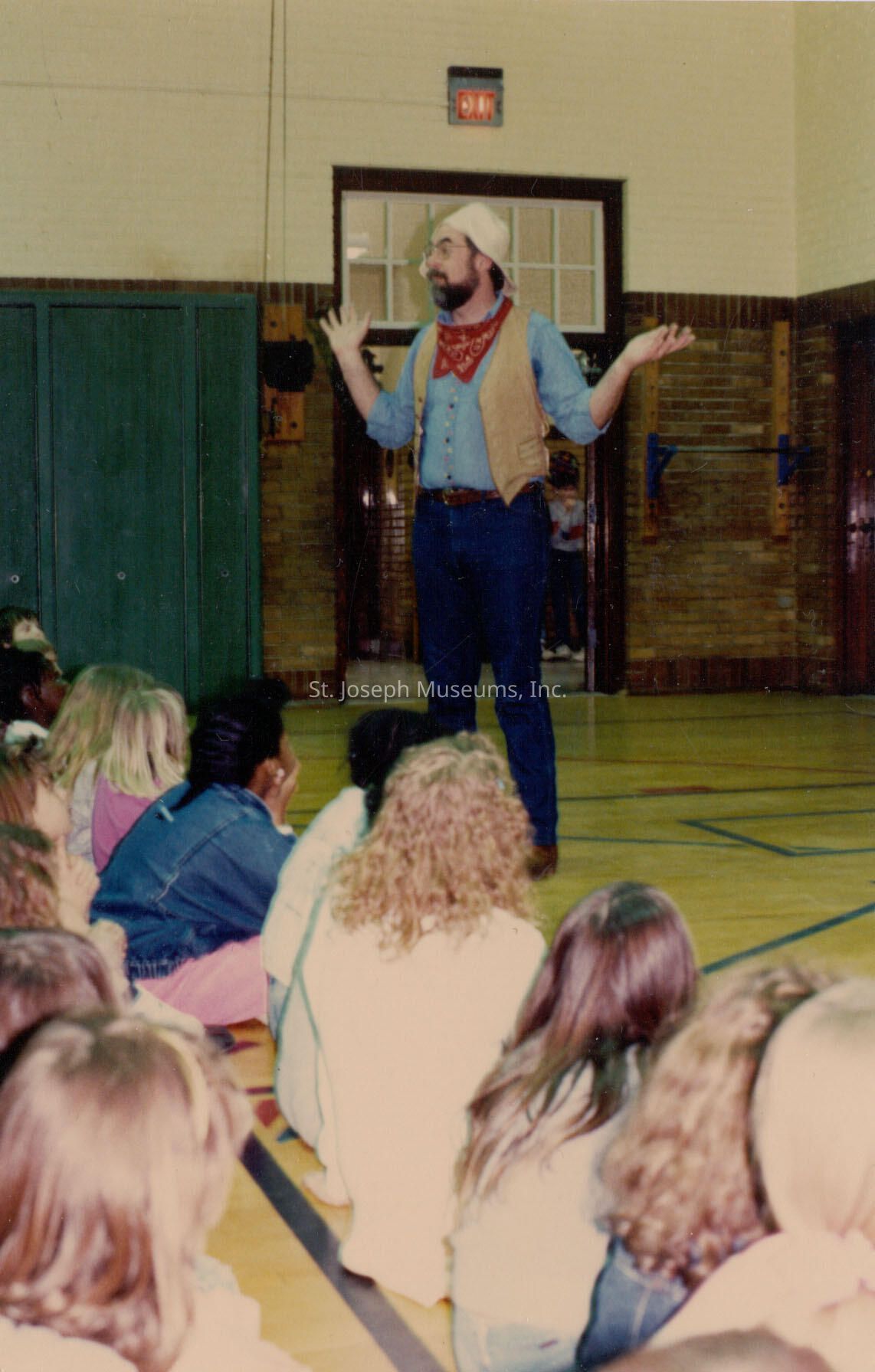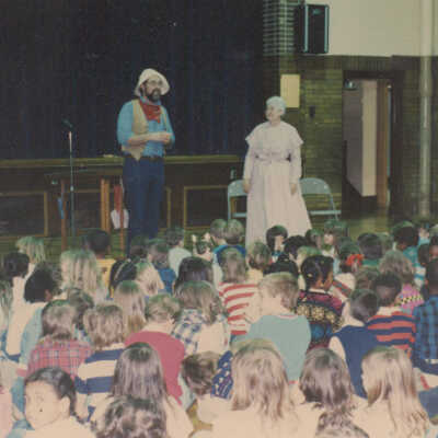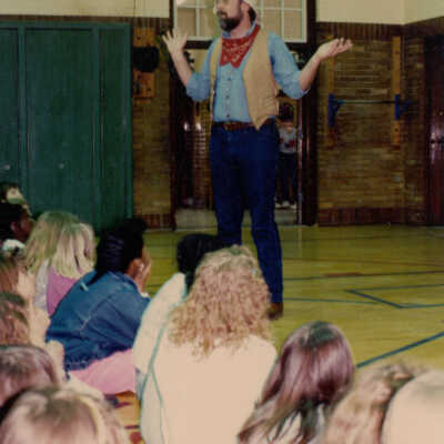 Pony Express 130th Anniversary Celebration, School Program Snapshots, 1990. Six color snapshots taken in schools where storyteller and musicians brought the story of the Pony Express to elementary schools.