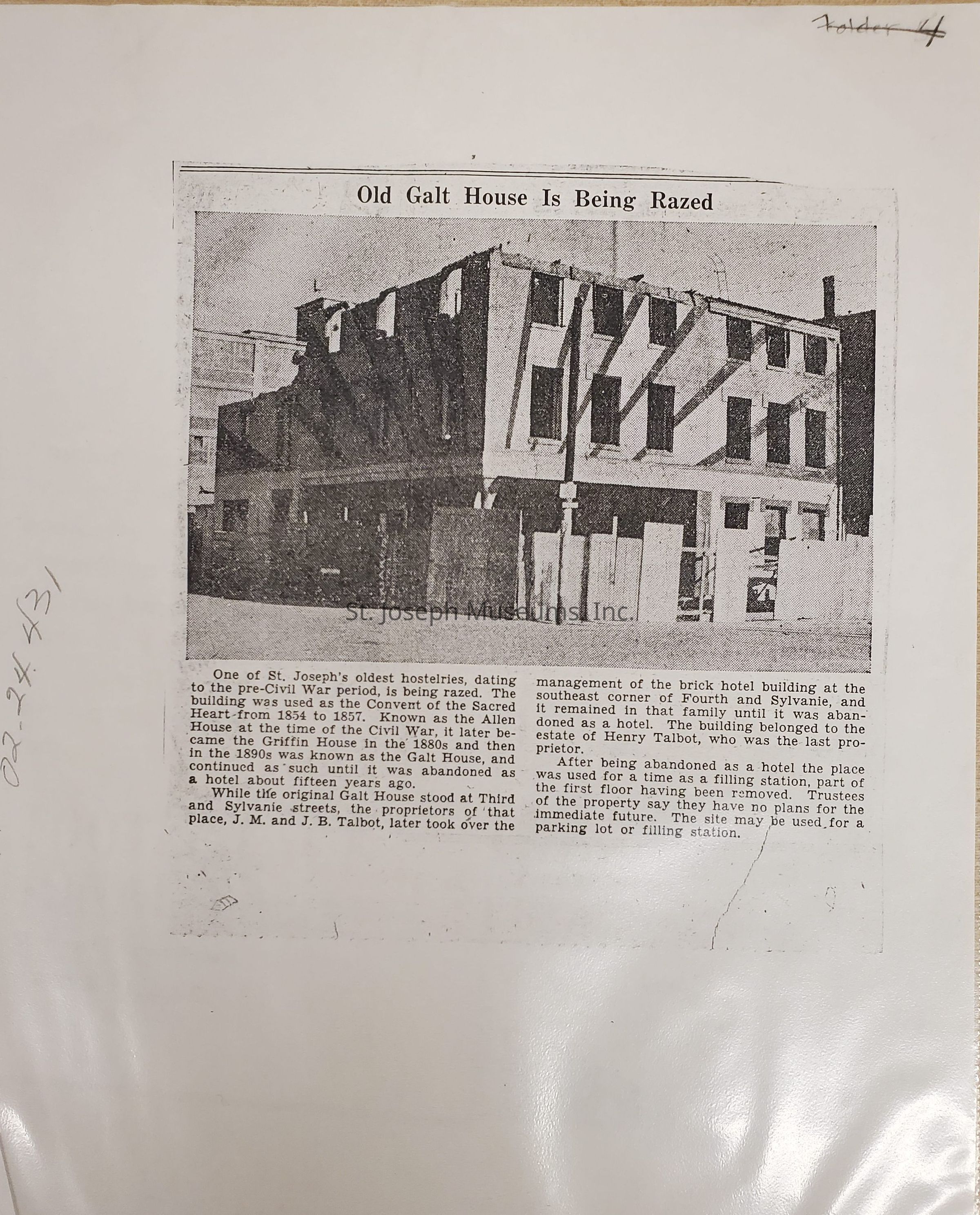 News clipping - "Old Galt House Is Being Razed". Galt House,4th Sylvanie, was one of the oldest hosteleries of the pre-Civil War period.