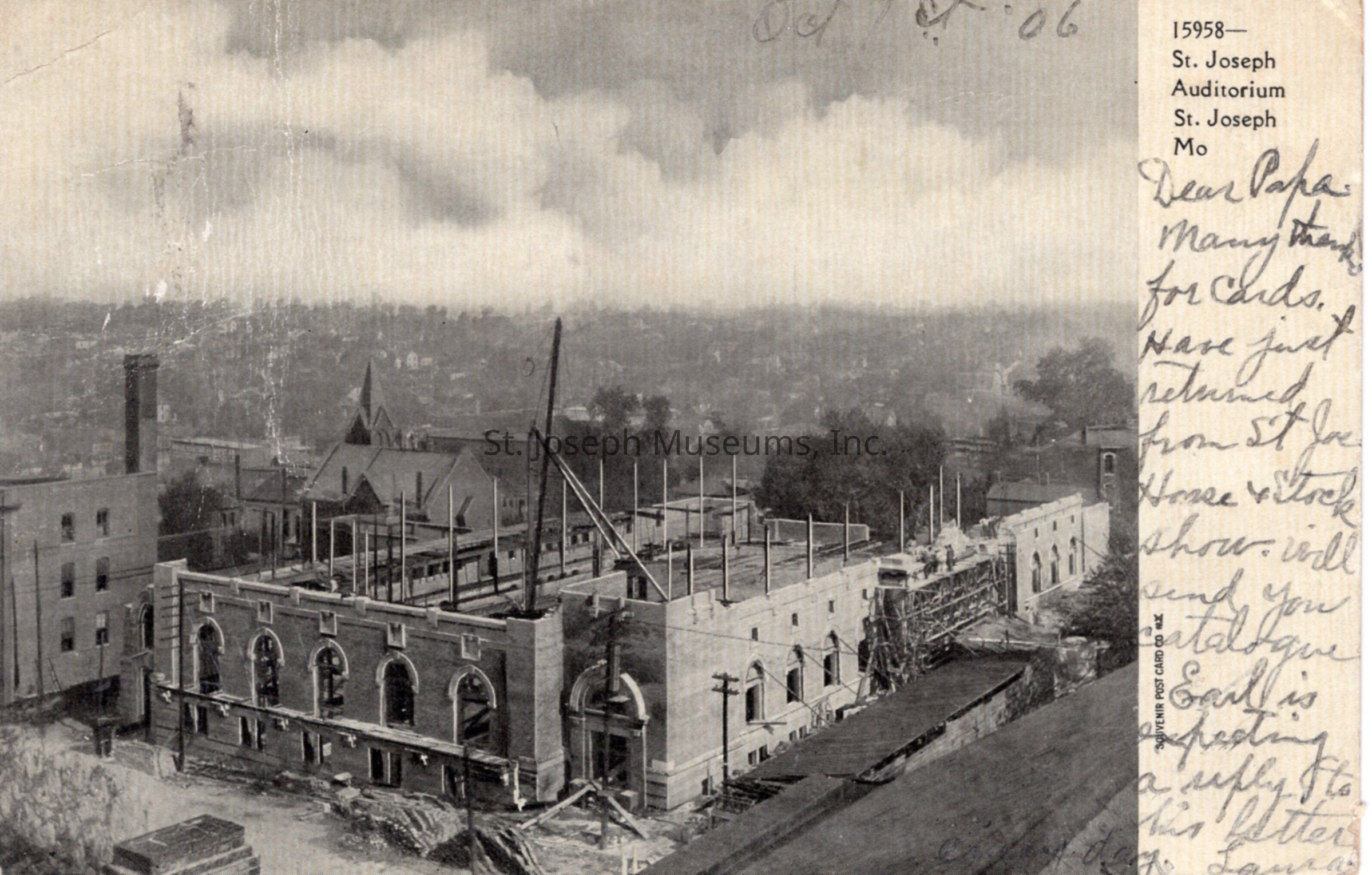 City Auditorium Under Construction, St. Joseph, MO. Postcard, 1906. b/w photo of building in stage of construction, walls constructed but open roof area. Sender had just returned from St. Joe Horse & Stock Show.