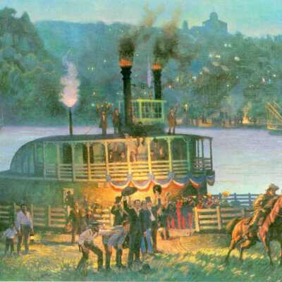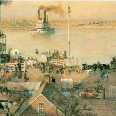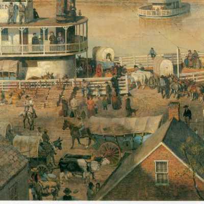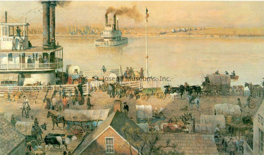 2020.1.204C = Saint Jo Waterfront, 1850. Depicts steam ferry at bank, wagons & cattle being loaded. Another ferry returning from Kansas side.