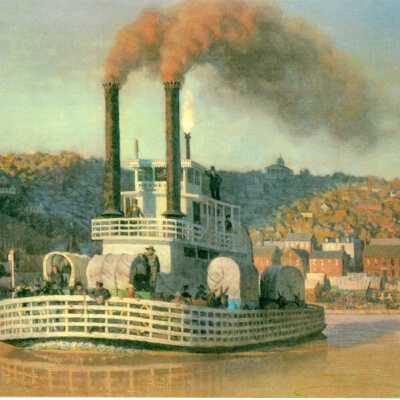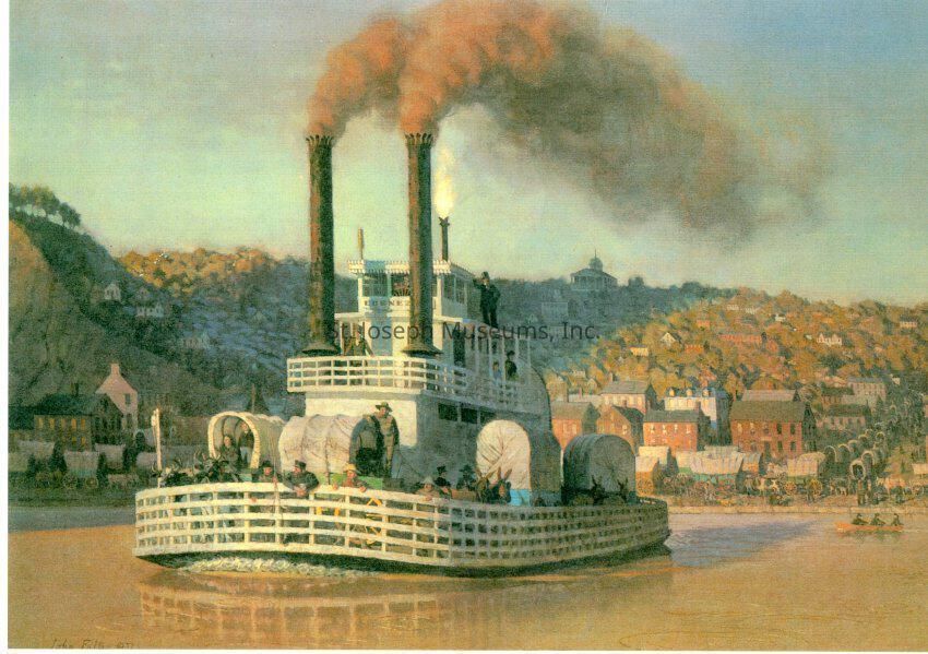 2020.1.204D = Across the Wide Missouri, 1850. Steam ferry headed west across the Missouri River with covered wagons aboard.