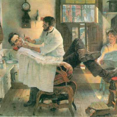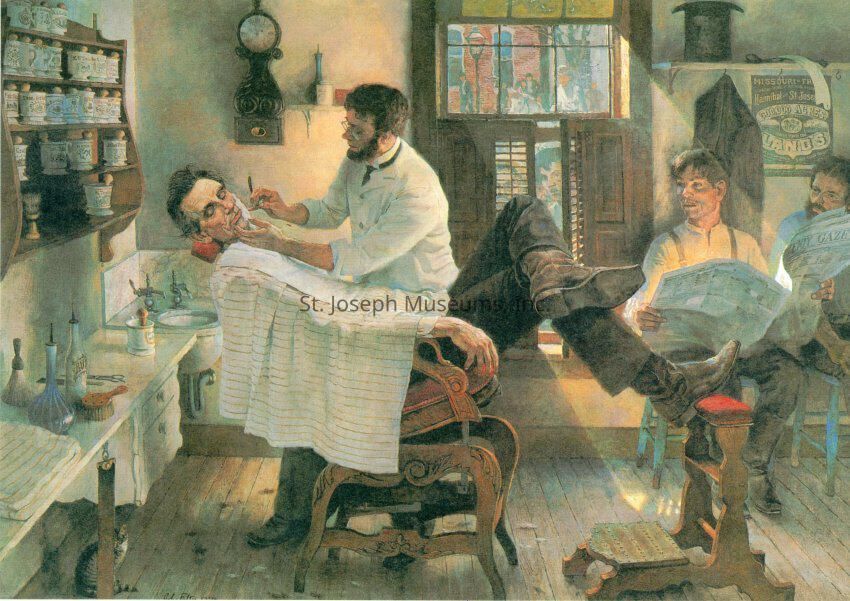 2020.1.204G = Tuesday, August 11, 1859, 9 A.M. Abraham Lincoln in barbershop getting shave during his visit to N.E. Kansas.