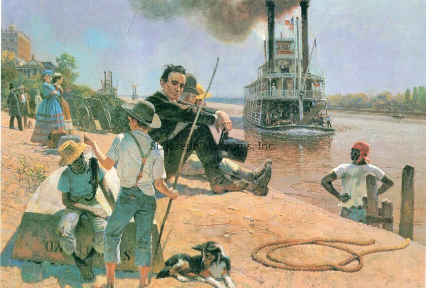 2020.1.204H = Tuesday, August 11, 1859, 11 A.M. Abraham Lincoln seated on riverbank awaiting transport to Kansas side.Lexicon