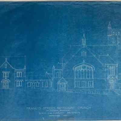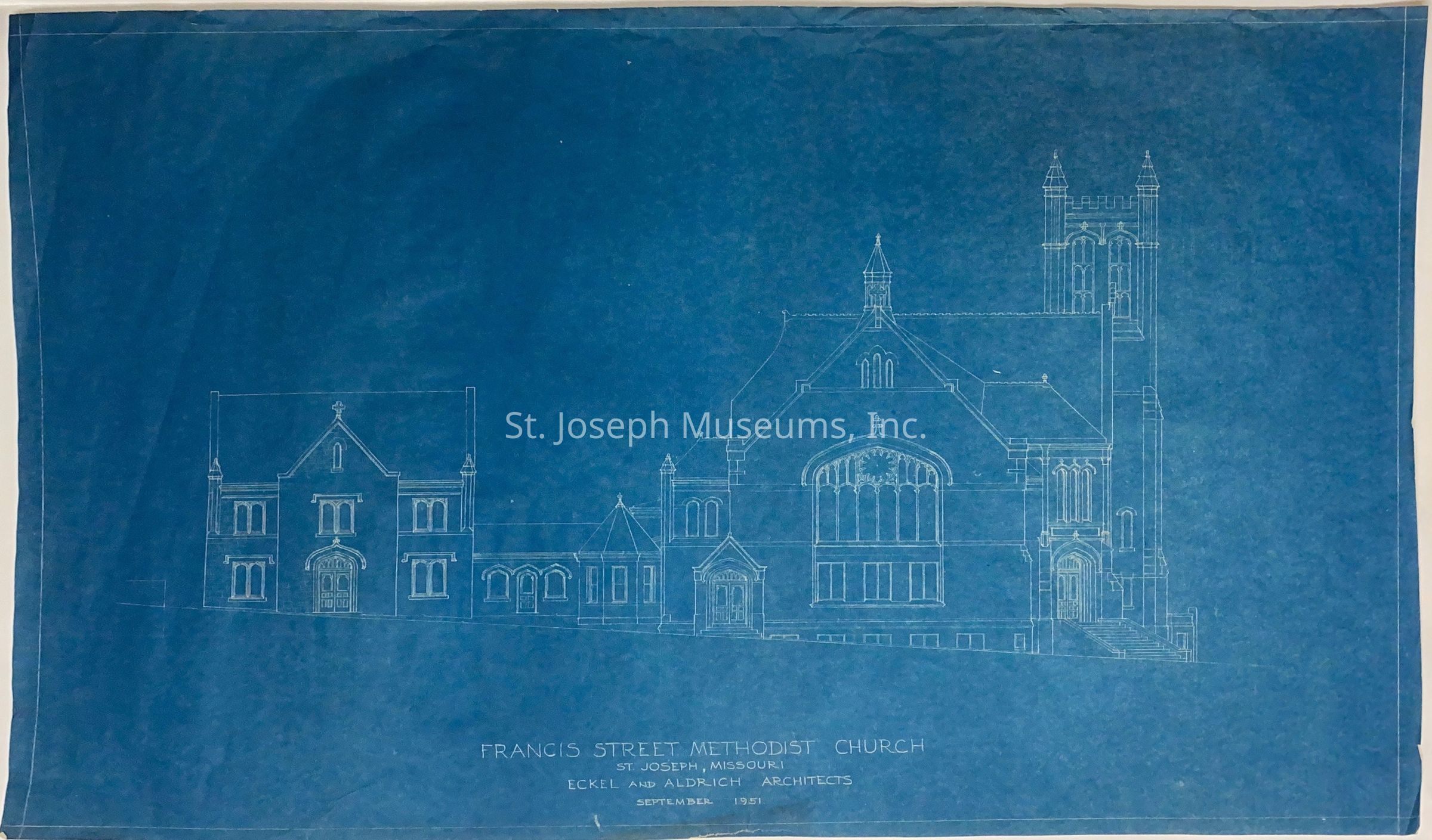 Francis Street Methodist Church, 110 N. 12th, Rendering, 1951. S.W. corner 12th & Francis, St. Joseph, Missouri. Exterior Drawing, blue paper. North entrance elevation. .