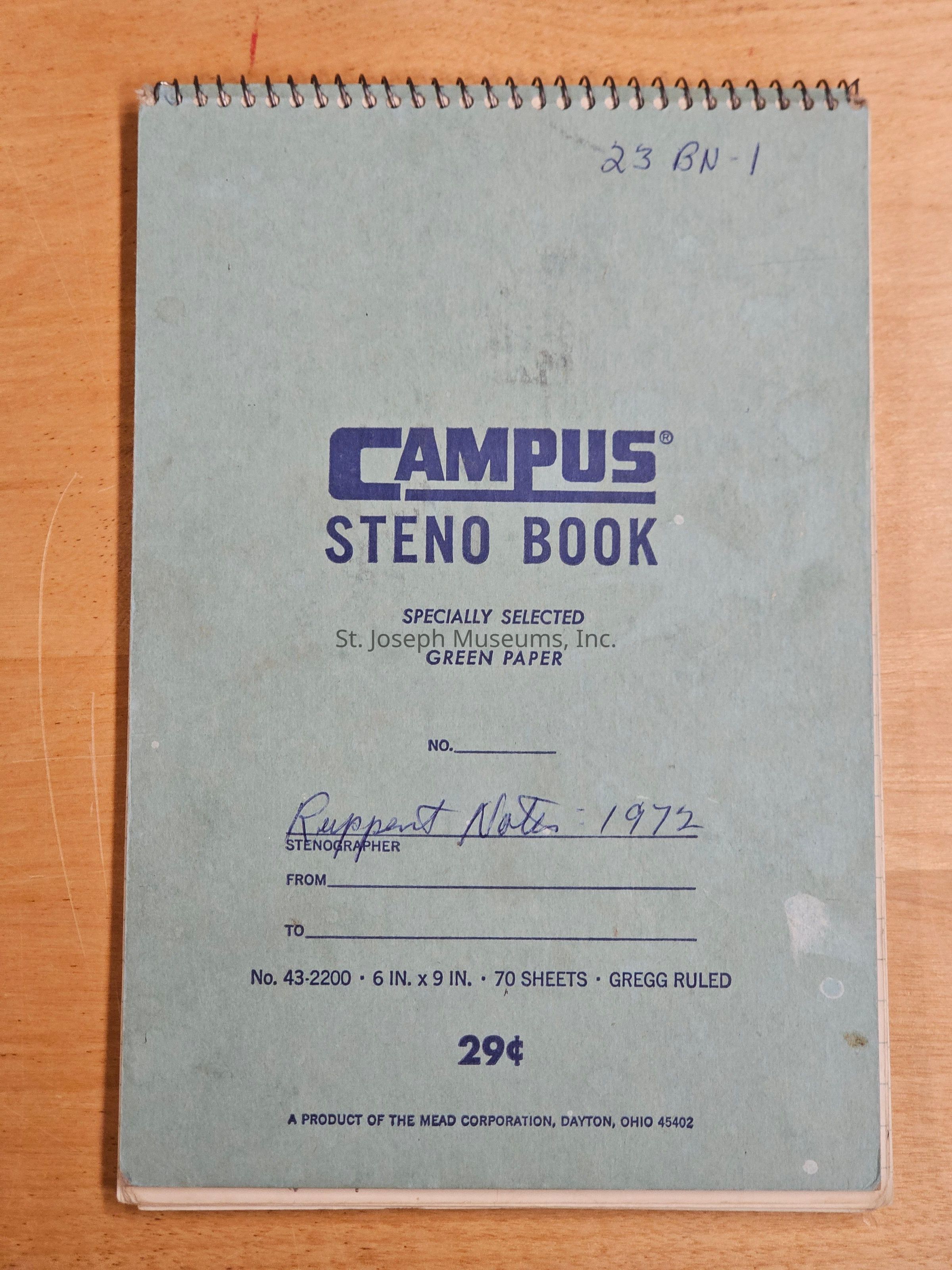 Notebook containing field notes written by Ruppert chronicling the 1972 excavation of 23BN1