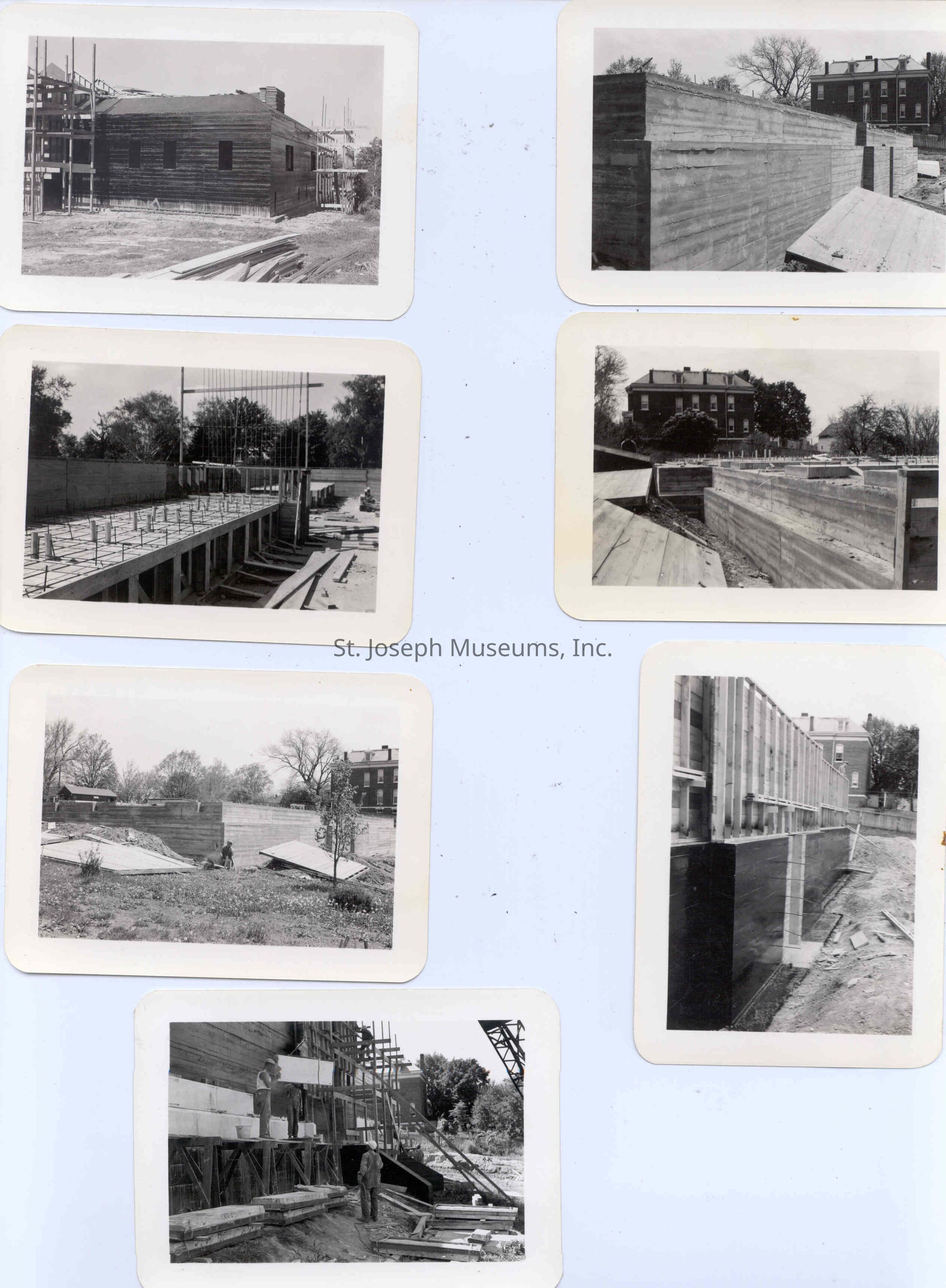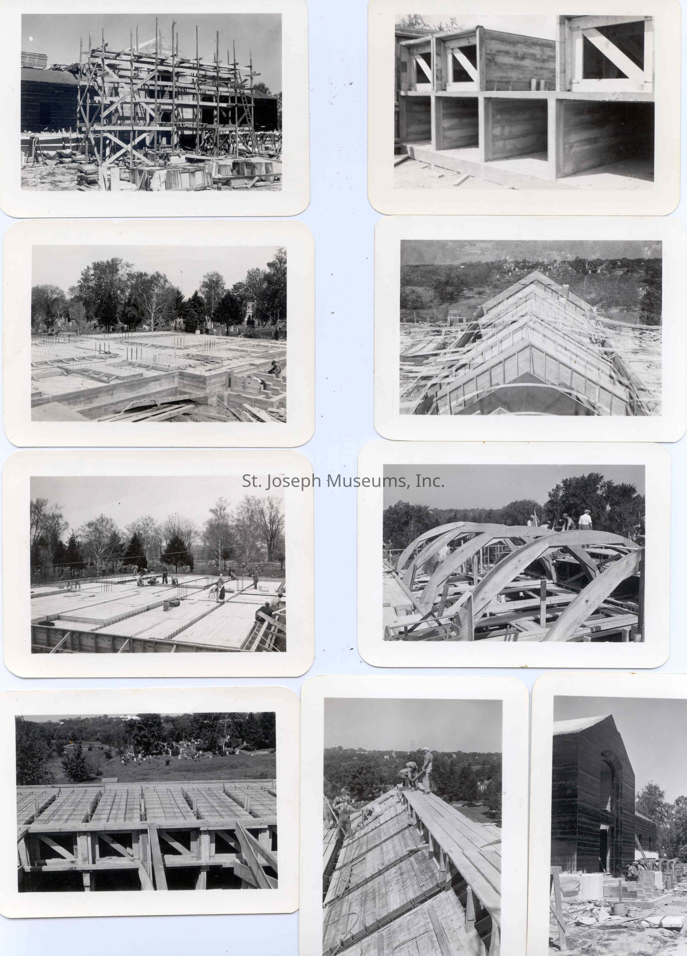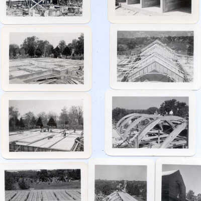 Ashland Mausoleum Construction Photograph Album, 1940. 39 b/w snapshots of the construction of the mausoleum at Ashland Cemetery in St. Joseph, Missouri. Photos dated from April 26, 1940 through July 18, 1940. Lehr Construction Co., Builders. Lovell & Lovell, Architects.