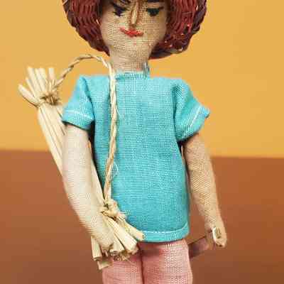 Handmade doll wearing red pants, green shirt and red straw hat. Blade in left hand and carrying a basket over right shoulder. From the collection of Gladys Rinehart