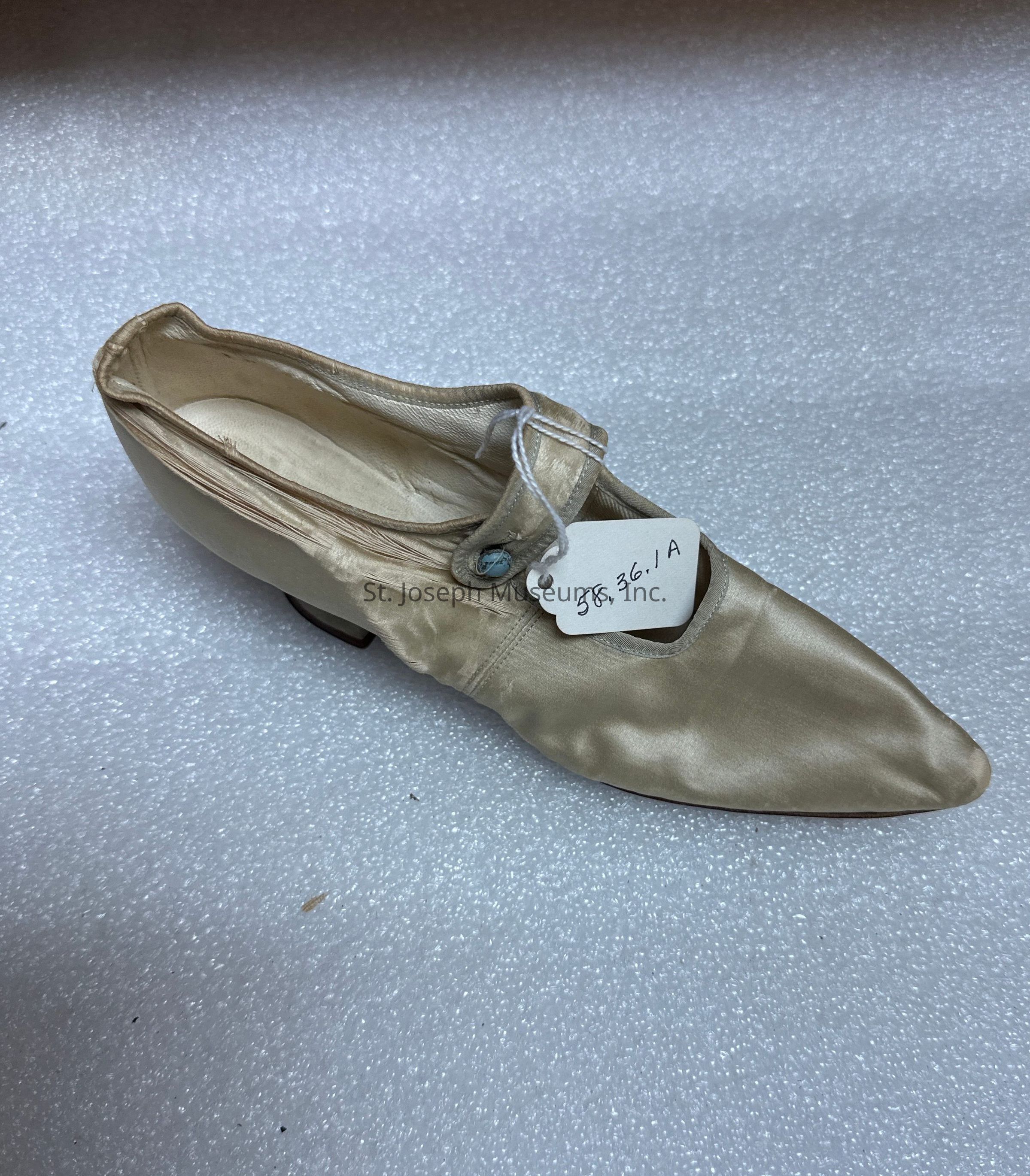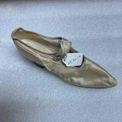 The image shows a single ivory shoe made from a light satin material, featuring a pointed toe and strap fastened with a small button.