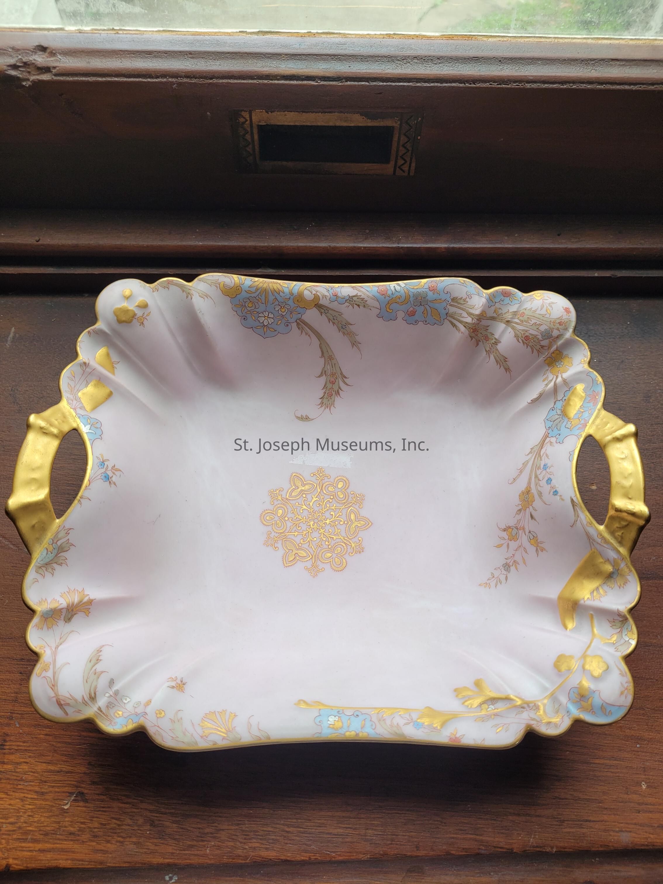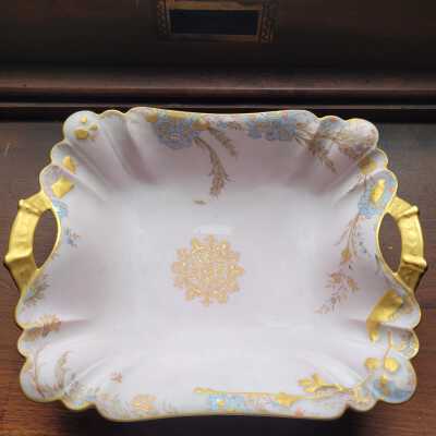 China set/porcelain/pinkish white/gold, silver, pinks and blues/floral designs/ A-Platter/ribbon design handles/ "Haviland & Co Pour Regnier & Shoup Crockery Co Atchison Kas and St. Joseph Mo H&Co. L"/11"x9"x3.5"