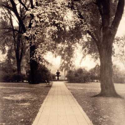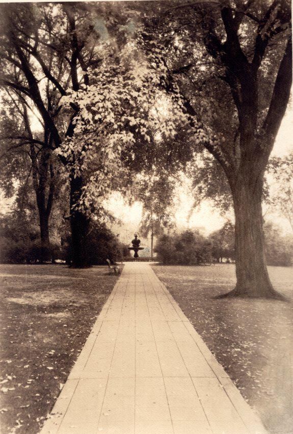 City Hall Dolphin Fountain Photo, c. 1930. View of walk in park next to City Hall. Long walk with fountain at end. Fountain base is round, the "dolphin" rising above. View to Southwest, This is a replica of an Italian Fountain.