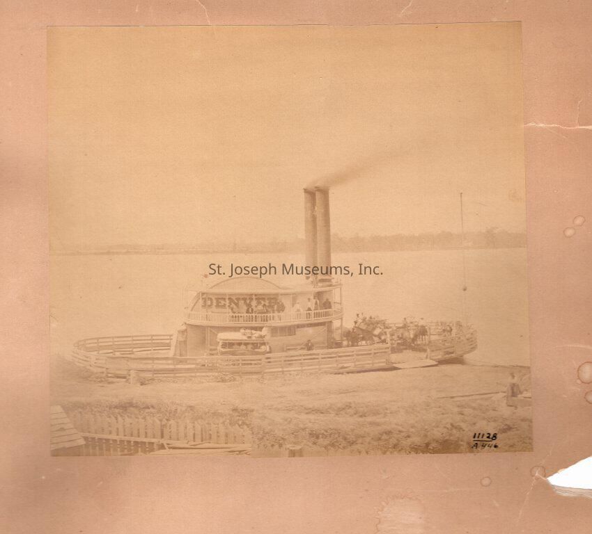 Steamboat Denver Used by Pony Express to Cross Missouri River Photo, c. 1860. Photo of steamboat docked along riverbank. "Denver" prominently displayed on top deck, where people are standing by rail. Other passengers aforedeck. St. Joseph Bus Co. 'taxi' waiting alongside vessel. Captain of boat was Capt. Flemming.. Sepia.